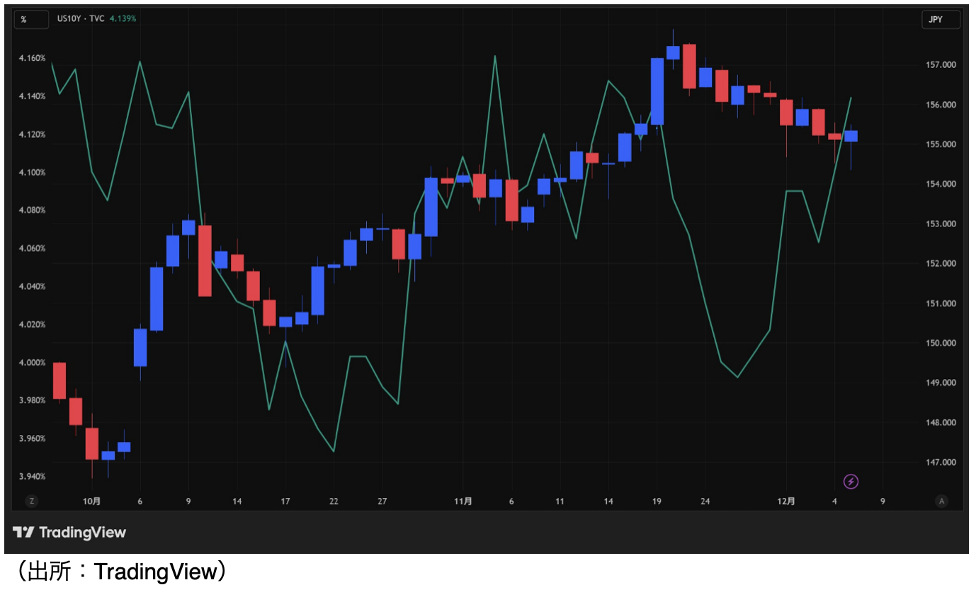 チャート:ドル円の10月からの日足、米10年債利回りは緑線(左軸)