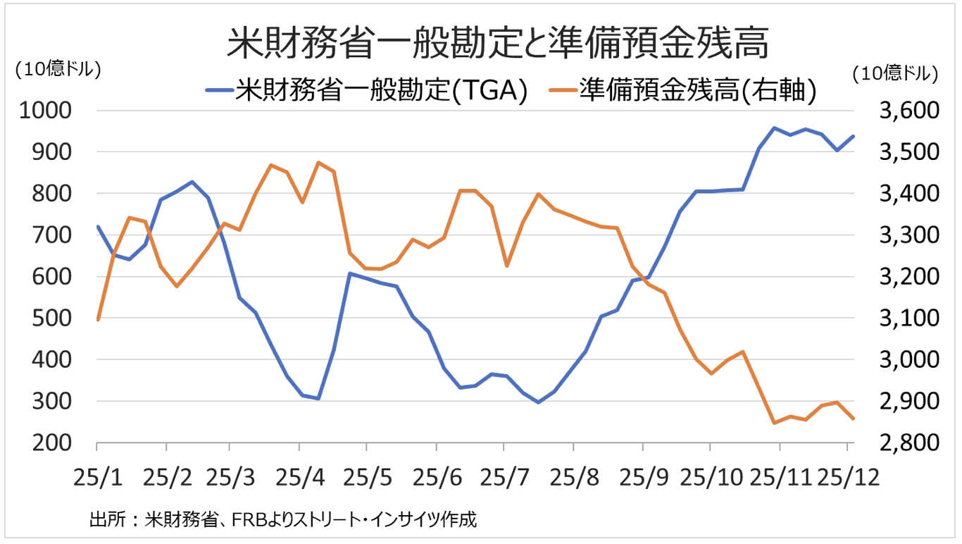 QTの決定は、金融システムに十分資金が行き渡ってないリスクへの対応と言える。QT停止前までの縮小の余波や、Tビルを含む米国債の大量発行などにより、銀行の流動性を示すバロメーターである準備預金残高は、12月3日週に2兆8,580億ドルに減少した。