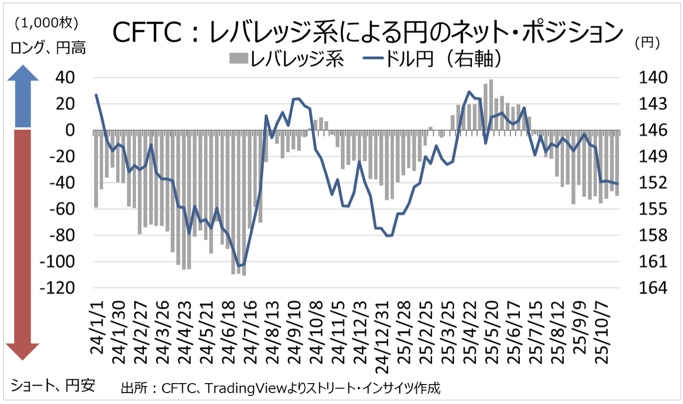 レバレッジ系(ヘッジファンド勢など)による円先物のネット・ポジション動向は5万2,101枚のネット・ショートが縮小。ただし、引き続き24年7月30日週以来の高水準を視野に入れた水準となる。