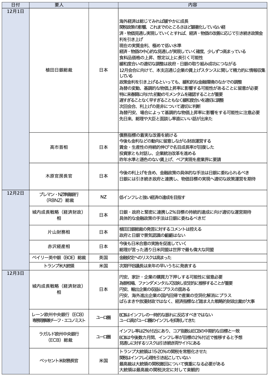 そして植田氏は12月1日、講演で自ら12月利上げへの狼煙を上げた。経済・物価の見通しが実現していくとすれば、利上げが可能との見解を寄せただけでなく、明確に12月18~19日会合の日付に言及し、「次回の決定会合に向けて、本支店を通じ、企業の賃上げスタンスに関して精力的に情報収集しているところ」と述べた。2026年1月に予定する支店長会議の前に、前回会合で示した、「春闘の初動のモメンタムについて情報を集めたい」とする発言の伏線回収に取り組んだ格好だ。その上で、「利上げの是非について、適切に判断したい」と言い切った。