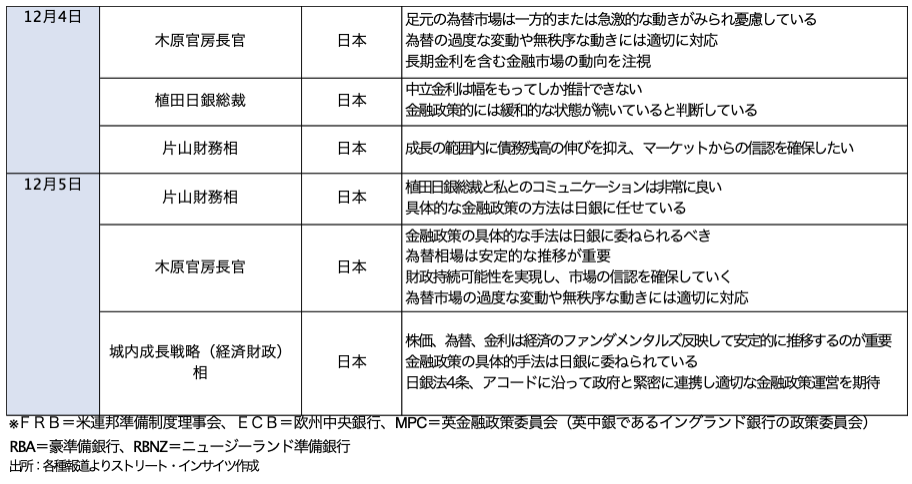 植田氏の発言は、11月20日に小枝審議委員の「基調的インフレ率は2%ぐらい」、11月22日付の増審議委員の日経新聞インタビューにおける「利上げをしていい環境は整ってきている」に続く、利上げの地ならしと位置づけられる。ハト派の野口審議委員も、利上げが早すぎる場合と遅すぎる場合に言及したものの、会見で9月29日時点と同じく、利上げが近づいているとの認識が変わらないとも発言。12月会合を前に、政策委員会メンバー9人のうち、4人が12月利上げの布石を打ったことになる。