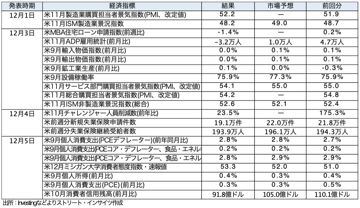 - 12月8日週の経済指標は、1日に中国11月貿易収支、日本10月実質賃金、日本Q3実質GDP成長率・改定値、9日はADP週次の全国雇用者数と米11月JOLTS(求人件数含む)、 10日は日本11月国内企業物価指数、中国11月CPIとPPI、米Q3雇用コスト指数の発表を予定する。11日には10-12月期四半期法人企業景気予測調査・大企業全産業業況判断指数、米新規失業保険申請件数、米9月貿易収支、12日には日本10月鉱工業生産を予定する。