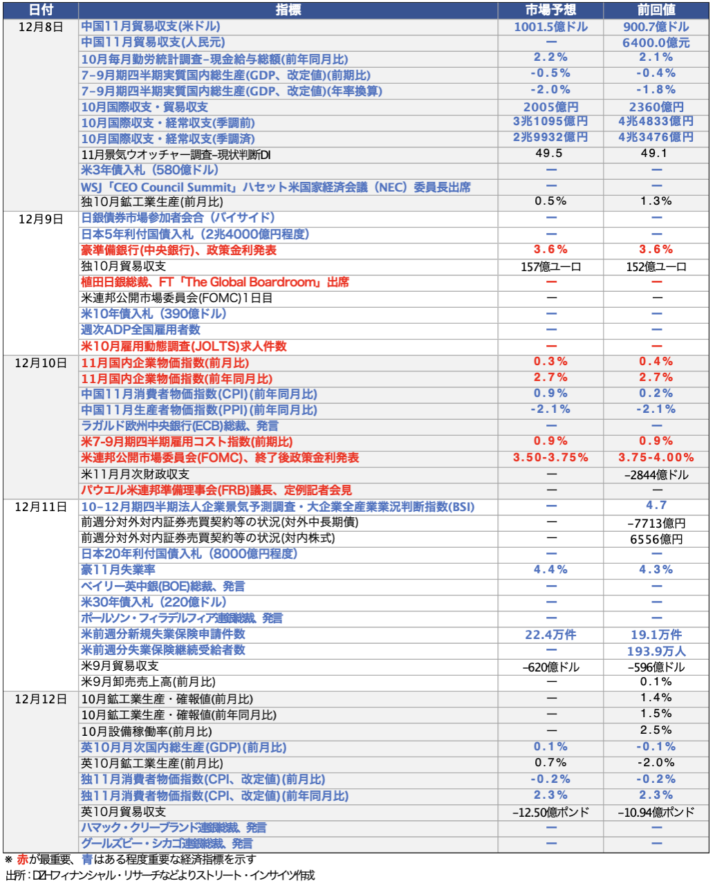 12月8日週の経済指標は、1日に中国11月貿易収支、日本10月実質賃金、日本Q3実質GDP成長率・改定値、9日はADP週次の全国雇用者数と米11月JOLTS(求人件数含む)、 10日は日本11月国内企業物価指数、中国11月CPIとPPI、米Q3雇用コスト指数の発表を予定する。11日には10-12月期四半期法人企業景気予測調査・大企業全産業業況判断指数、米新規失業保険申請件数、米9月貿易収支、12日には日本10月鉱工業生産を予定する。