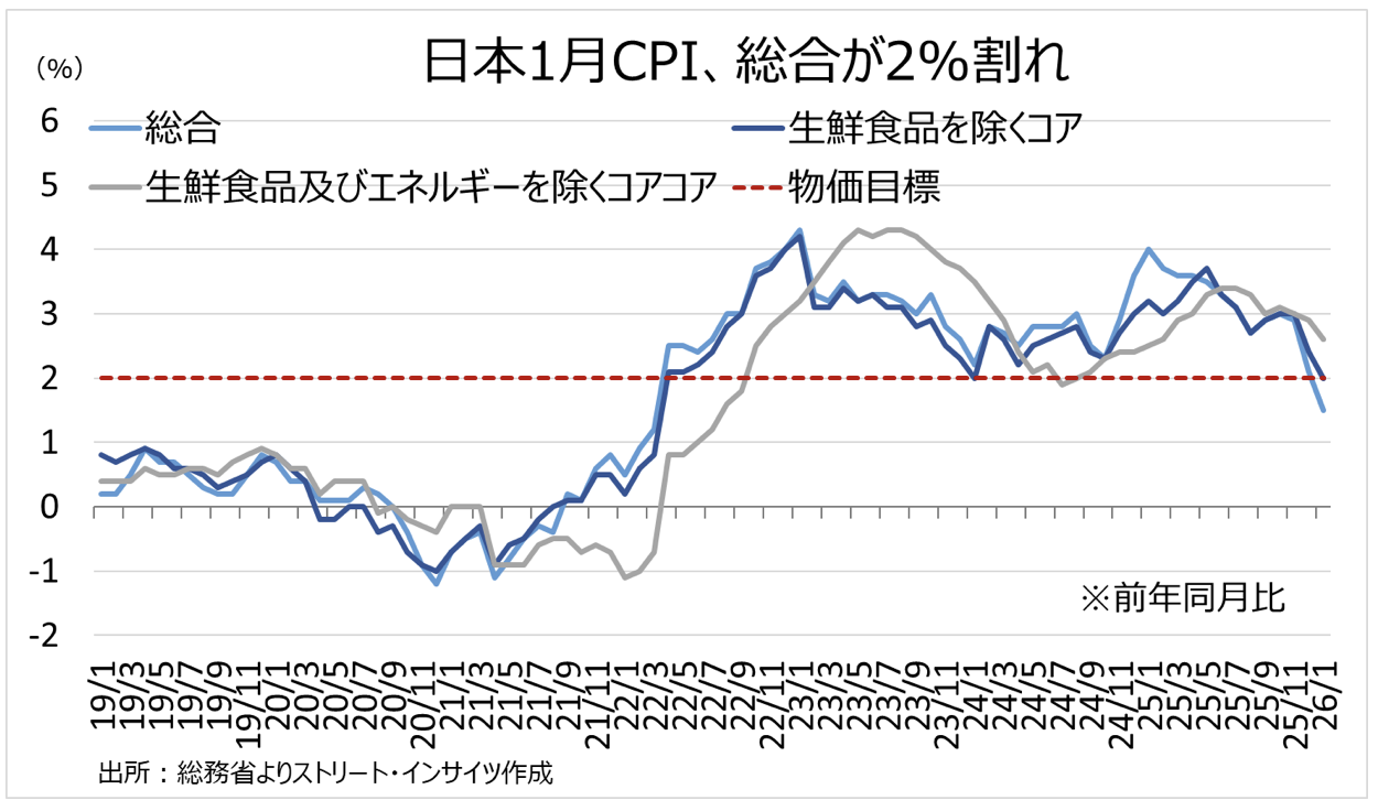 特に、日本の第4四半期実質GDP成長率が前期比0.1%増と、前期に同0.7%減の下げと比べ回復力が鈍い状況。1月全国消費者物価指数(CPI)は総合が前年同月比1.5%と、約4年ぶりの2%を割り込み、コア(生鮮食品を除く)も同2.0%と鈍化していた。コメなど食品価格の減速や、ガソリン暫定税率廃止を含めた物価対策の影響が大きい。