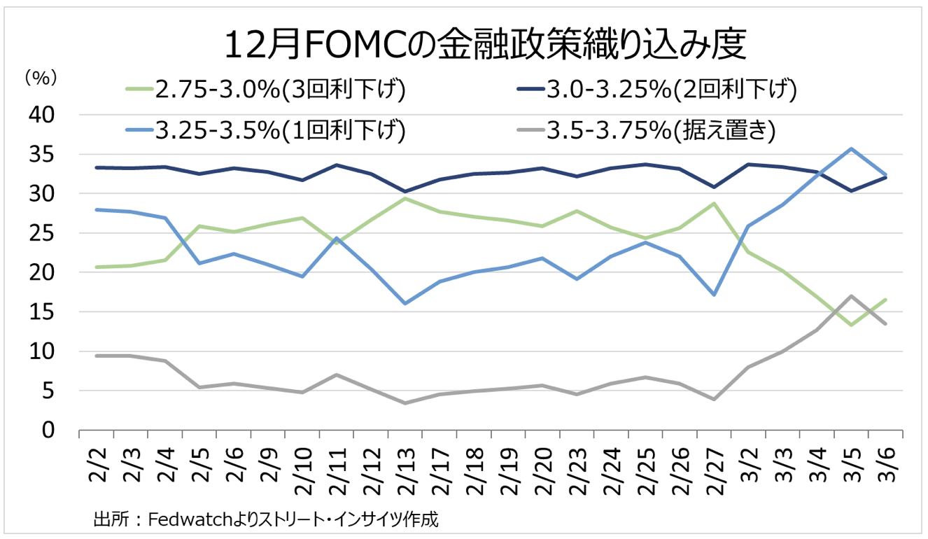 インフレ警戒で、FRBの利上げ観測は後退しつつあった。米1月生産者物価指数(PPI)は卸売業者と小売業の流通マージンを示すトレードサービスが前月比2.5%とデータ公表以来で最高を記録。米2月ISM製造業景況指数の仕入れ価格は、2022年6月以来の70超えに至った。もっとも、米2月雇用統計・非農業部門就労者数が前月比9.2万人減、失業率も4.4%と予想外に弱含んだ。一連の結果を受け、FF先物市場における12月FOMCの金融政策予想では、一時1回利下げの織り込みが35.2%と2回利下げを上回る場面がみられた。しかし、弱い米2月雇用統計を受け、直近では2回利下げと1回利下げの織り込み度がともに約32%で拮抗している。