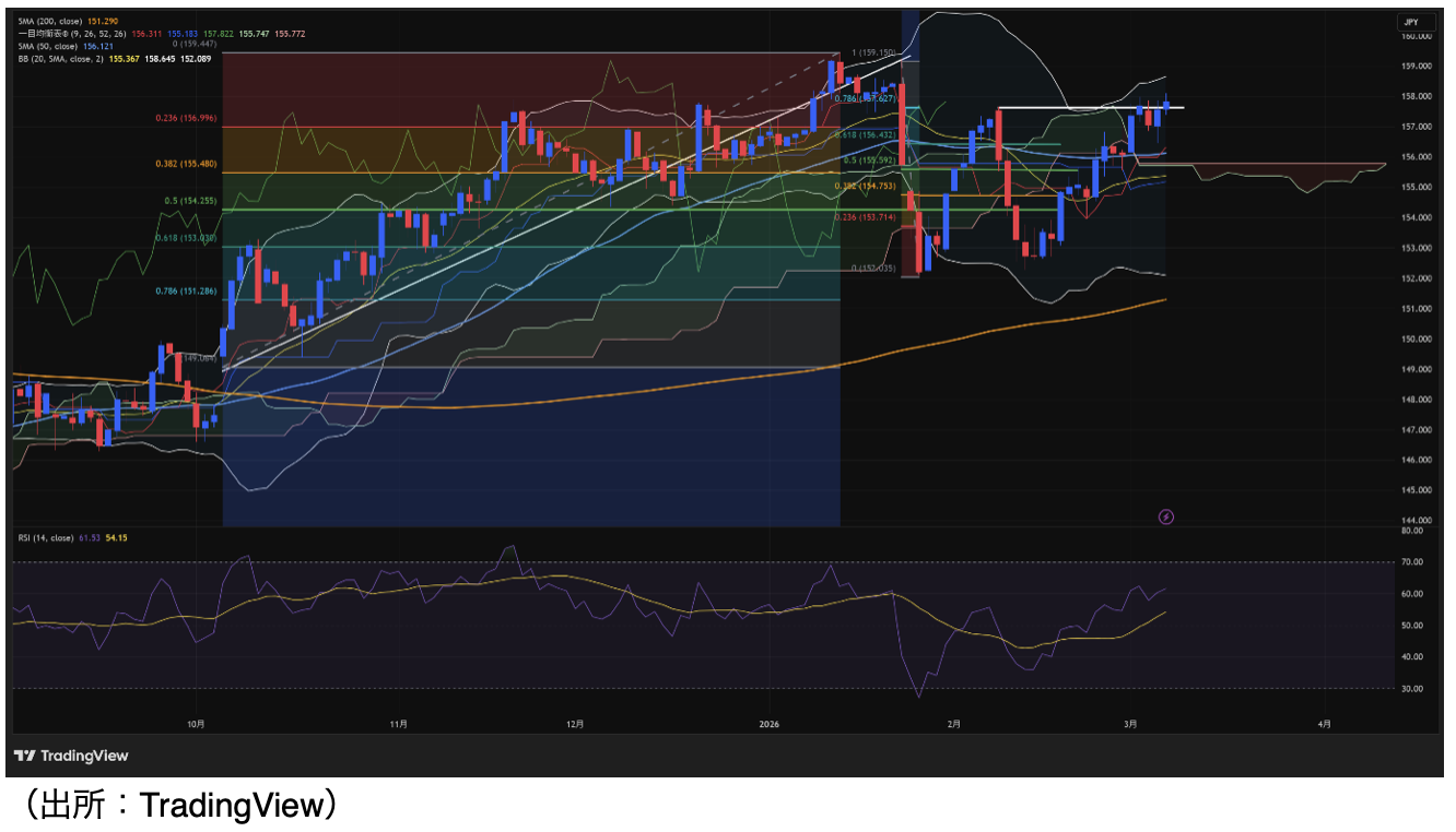 3日のドル円は、もみ合いを経て上昇。ドル円は、片山財務相が閣議後に「為替注視し必要な対応を取る」、「日米財務相共同声明に介入は盛り込まれている」と発言するなか、157円前半での推移を続け、一時157.15円まで本日安値を更新した。しかし、ロンドン時間から買いが再燃し、一時157.97円と1月23日以来の158円乗せに迫った。NY時間にトランプ大統領が米軍を投入してホルムズ海峡を通る石油・ガスタンカーを護衛する方針に加え、米国際開発金融公社(DFC)に対し、ペルシャ湾を航行する海上貿易に政治リスク保険と金融保証を提供するよう指示したことが報じられると、WTI原油先物が下落した動きにつれ、ドル円は上げ幅を縮小した。ただし、下値は堅く157円半ば程度にとどまった。