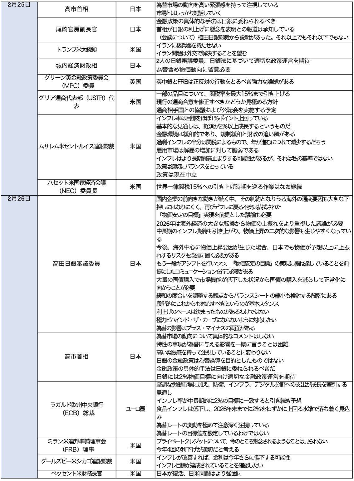 氷見野副総裁は3月2日に利上げ姿勢を確保しつつ、講演ではGDPギャップをめぐる異なる見解を取り上げ、3月利上げの選択肢を事実上、遠ざけた印象を与えたことが影響したとみられる。加えて、選挙中に物価高対策に「一区切りついた」と発言し、施政方針演説で成長戦略重視を鮮明にした高市政権が、利上げに慎重と受け止められ、円売りを促す側面もある。