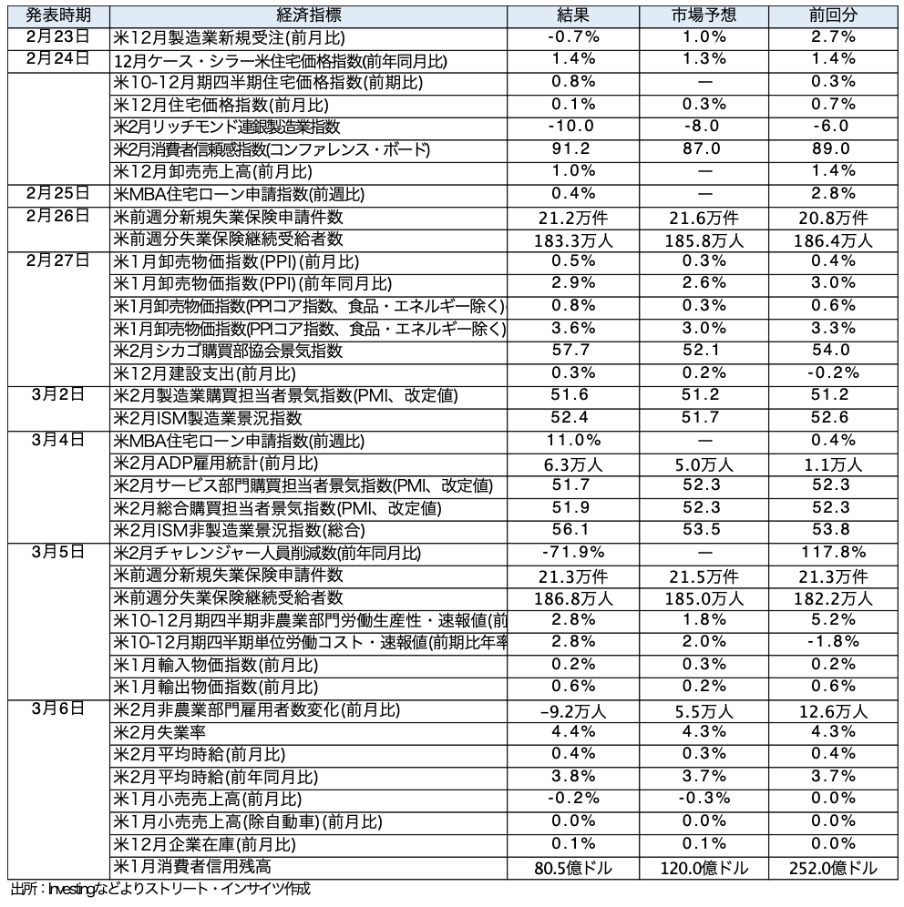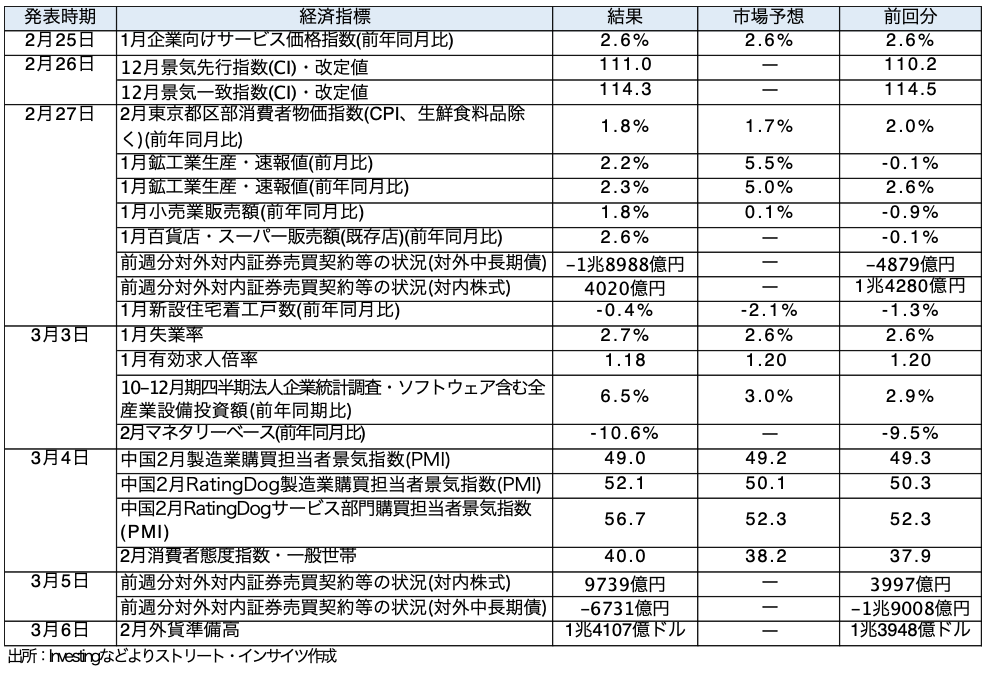 - 3月9日週の主な経済指標をみると、9日は日本1月実質賃金と国際収支、中国2月消費者物価指数(CPI)と生産者物価指数、10日は中国2月貿易収支、日本Q4実質GDP成長率・改定値などが控える。11日は日本2月企業物価指数、米2月CPI,12日は日本Q1法人企業景気予測調査、米新規失業保険申請件数、米1月住宅着工件数、13日は米Q4実質GDP成長率改定値、米1月PCE価格指数、米1月耐久財受注、米3月ミシガン大学消費者信頼感指数・速報値、米1月求人件数などを予定する。