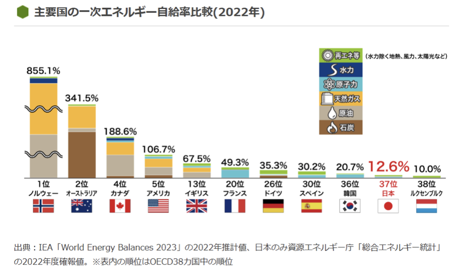 画像:主要国の一次エネルギー自給率比較(2022年)