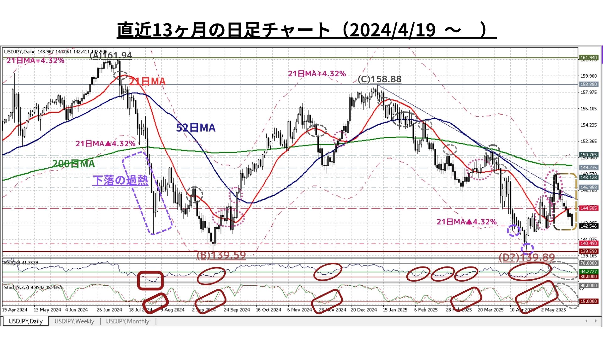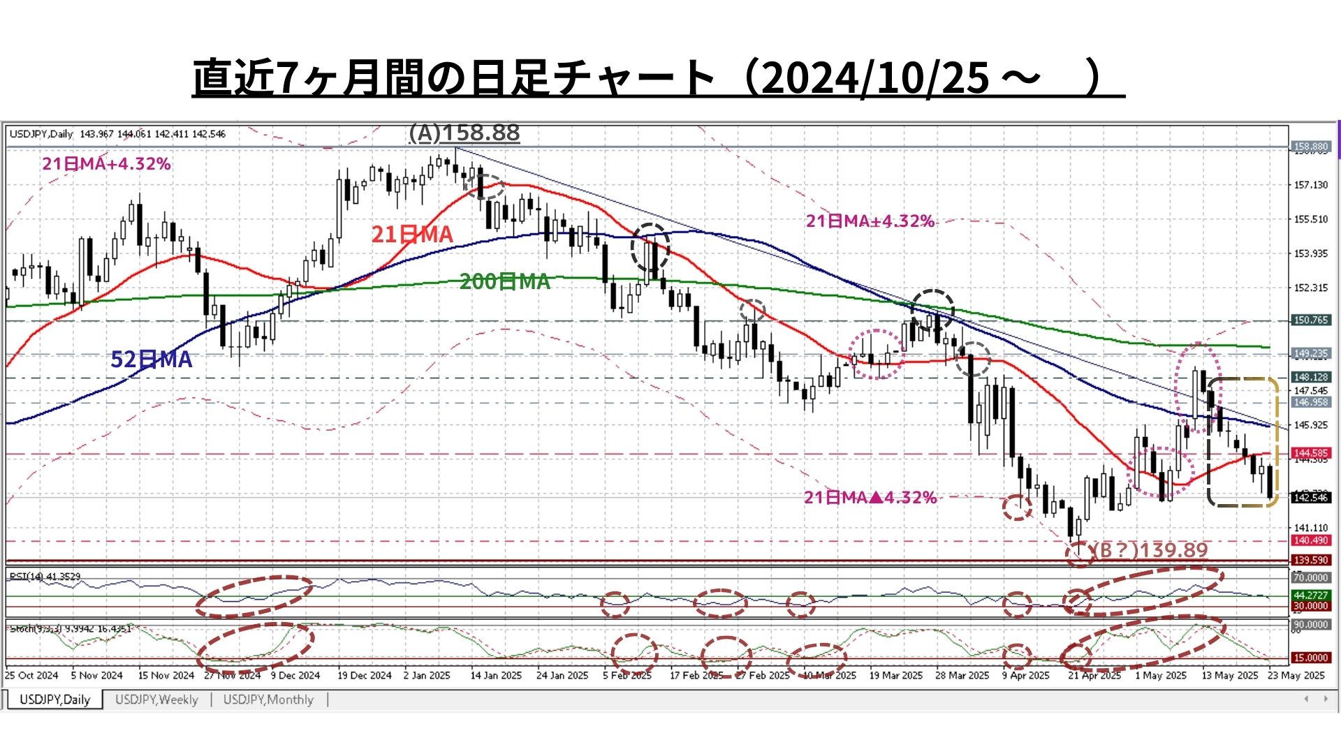 ➊日足チャート:「21MA±4.32%のバンド、52MA & 200MA」、RSI等