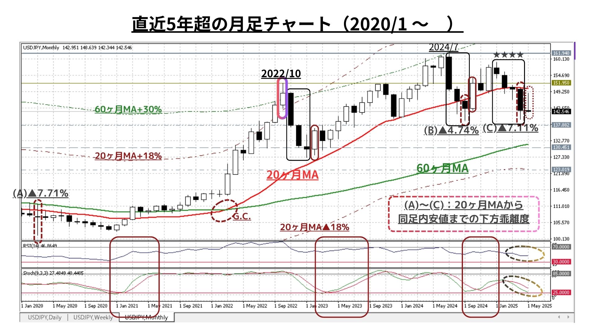 ➌月足チャート:「20MA±18.0%のバンド」「60MA±30.0%のバンド」、RSIを付記