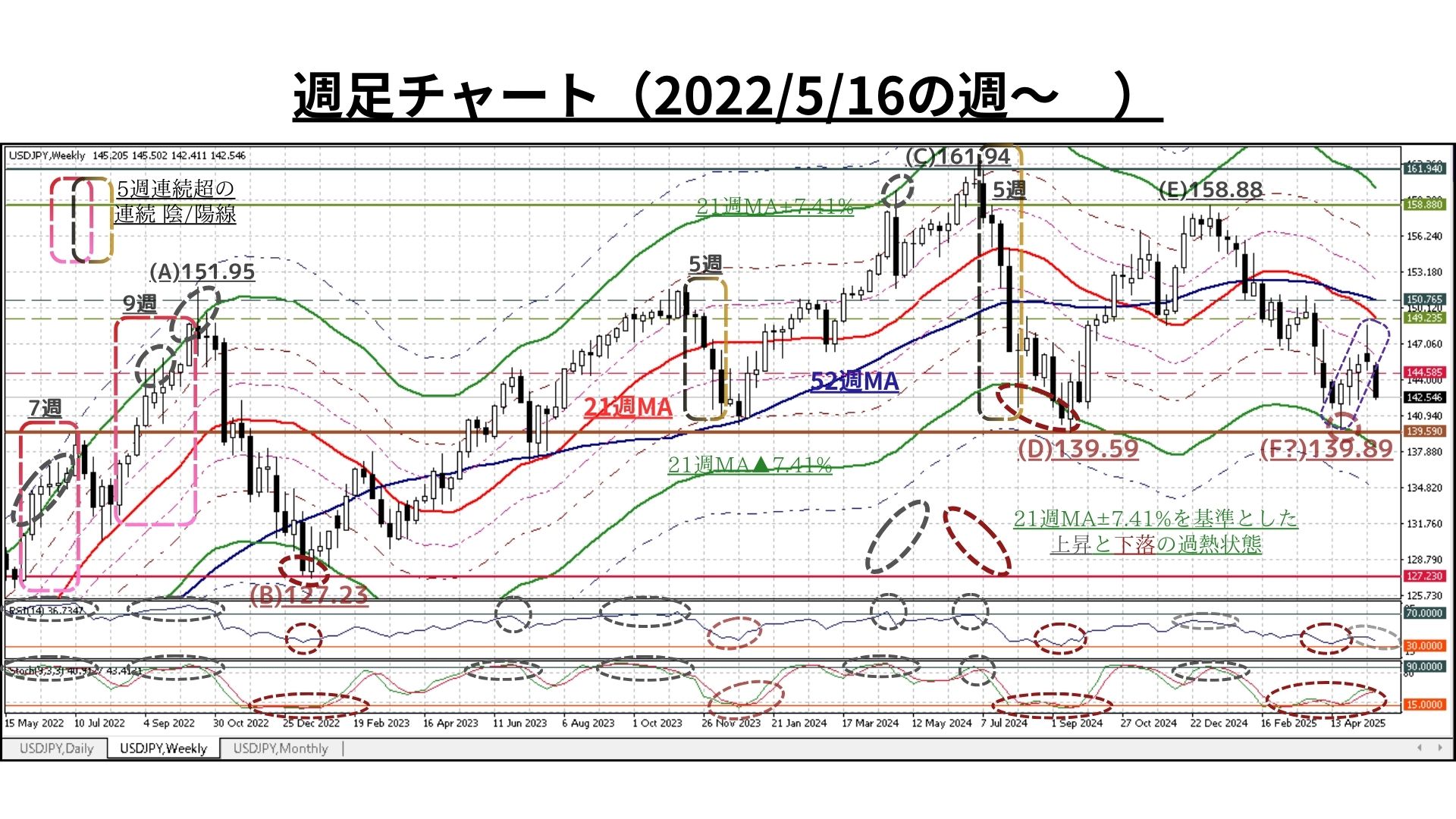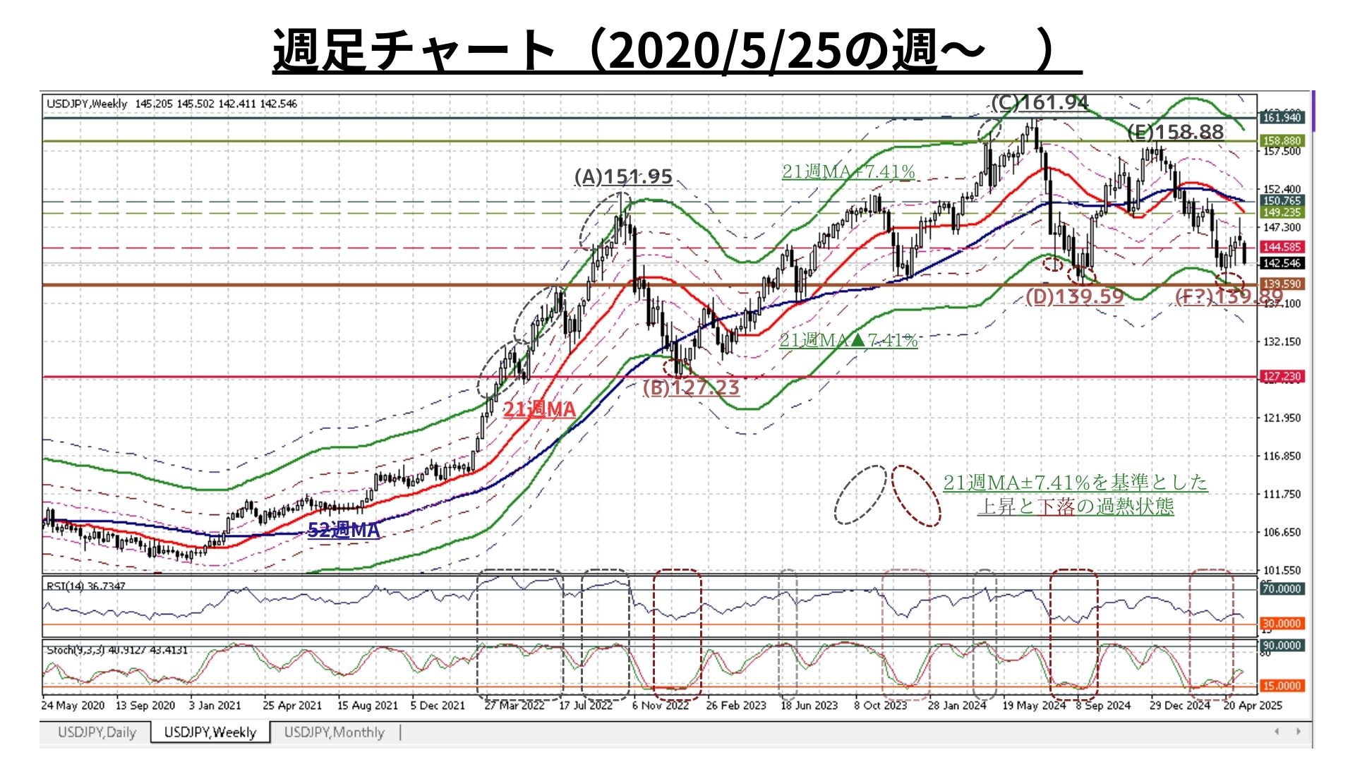 ➋週足チャート:「21MA±4.32%/±7.41%/±9.87%のバンド & 52MA」、RSI等