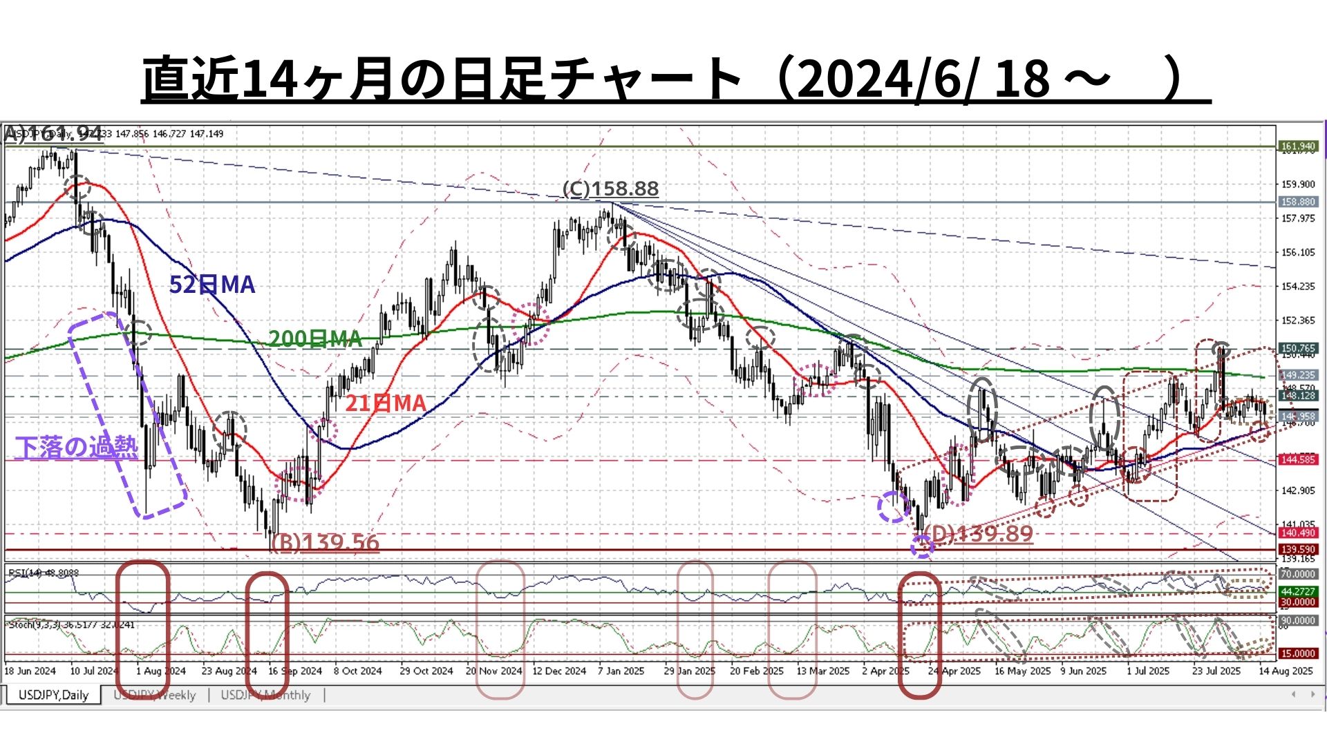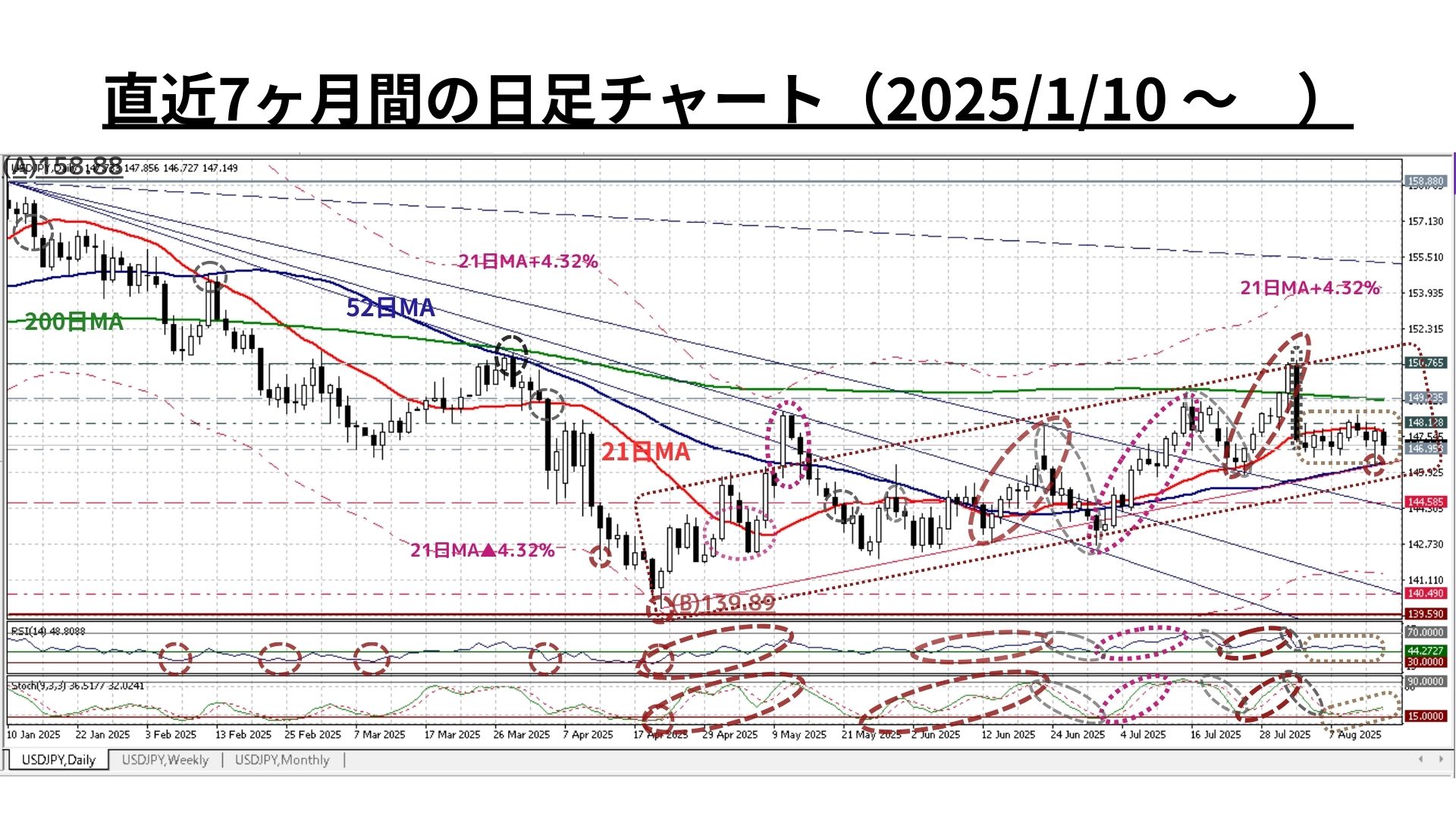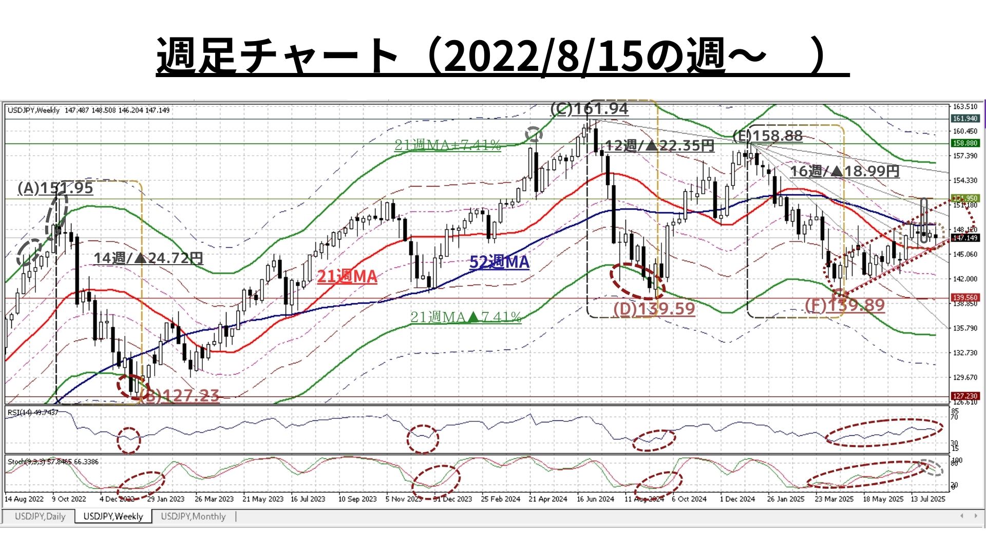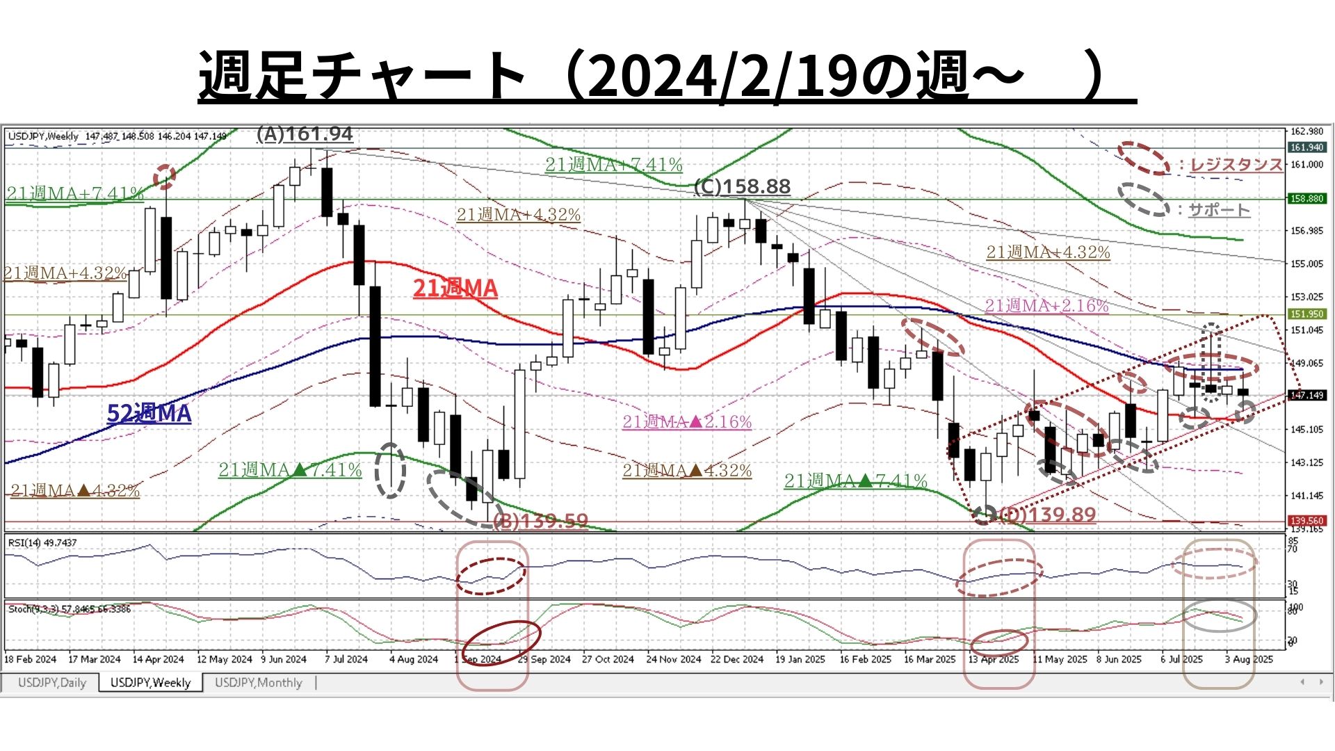 =>ただし、明確に21週MA(145.65@8/15)超の水準を上回っている現状ではあるが、52週MA(148.65@8/15)未満であり「過熱感は全くない(RSIやストキャスティクスも中立水準)」