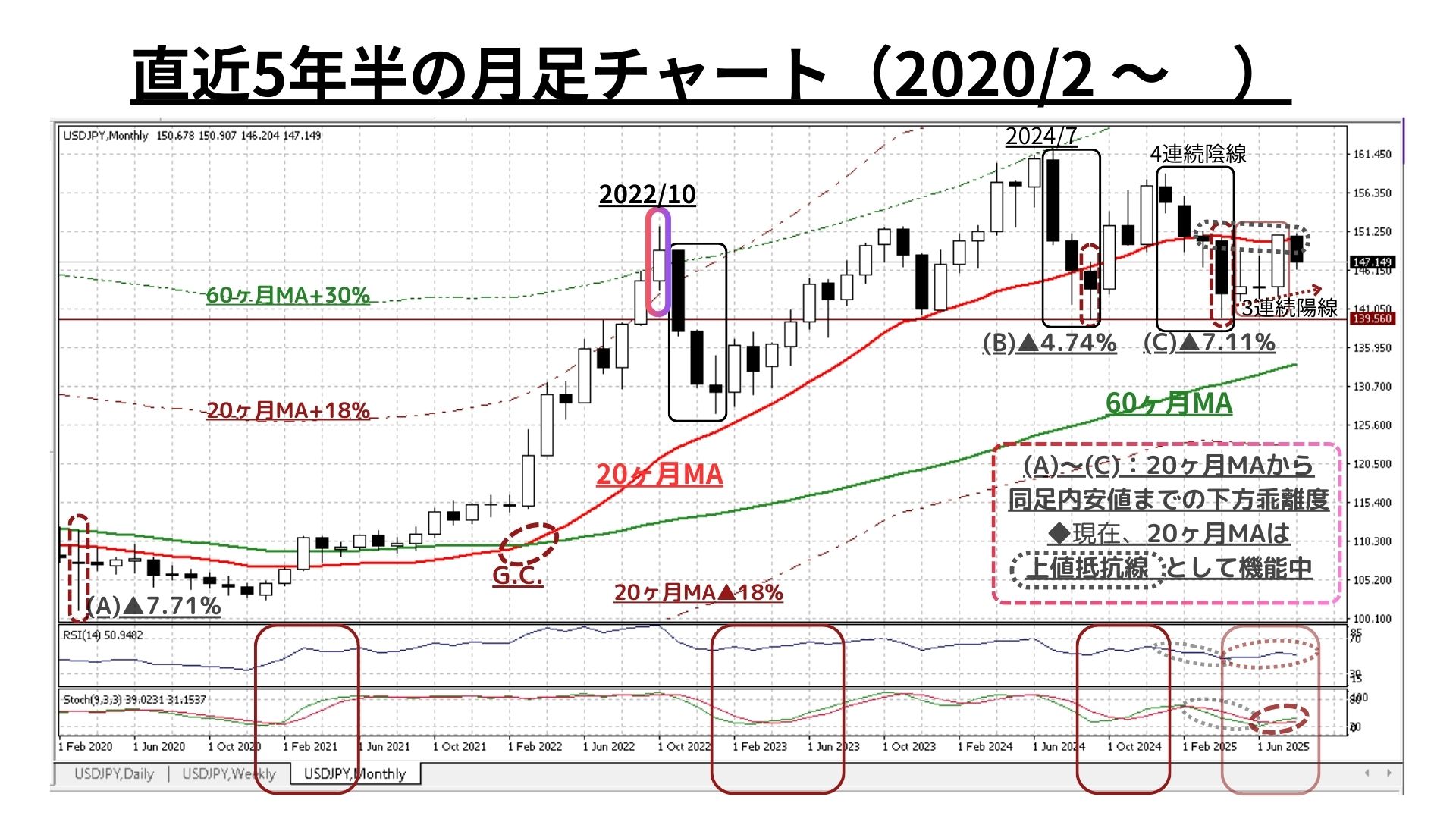 ➌月足チャート:「20MA±18.0%のバンド」「60MA±30.0%のバンド」、RSIを付記