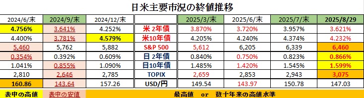 一方、ファンダメンタルズにおいては、注目されていたパウエルFRB議長の講演内容(@ジャクソンホール会議)が「“利下げ再開が接近”との示唆あり」として、以降の米国(海外)金融市場はリスクオンが大きく進展し、NYダウやS&P500を始め世界中で株価の史上最高値更新に沸く展開でした。