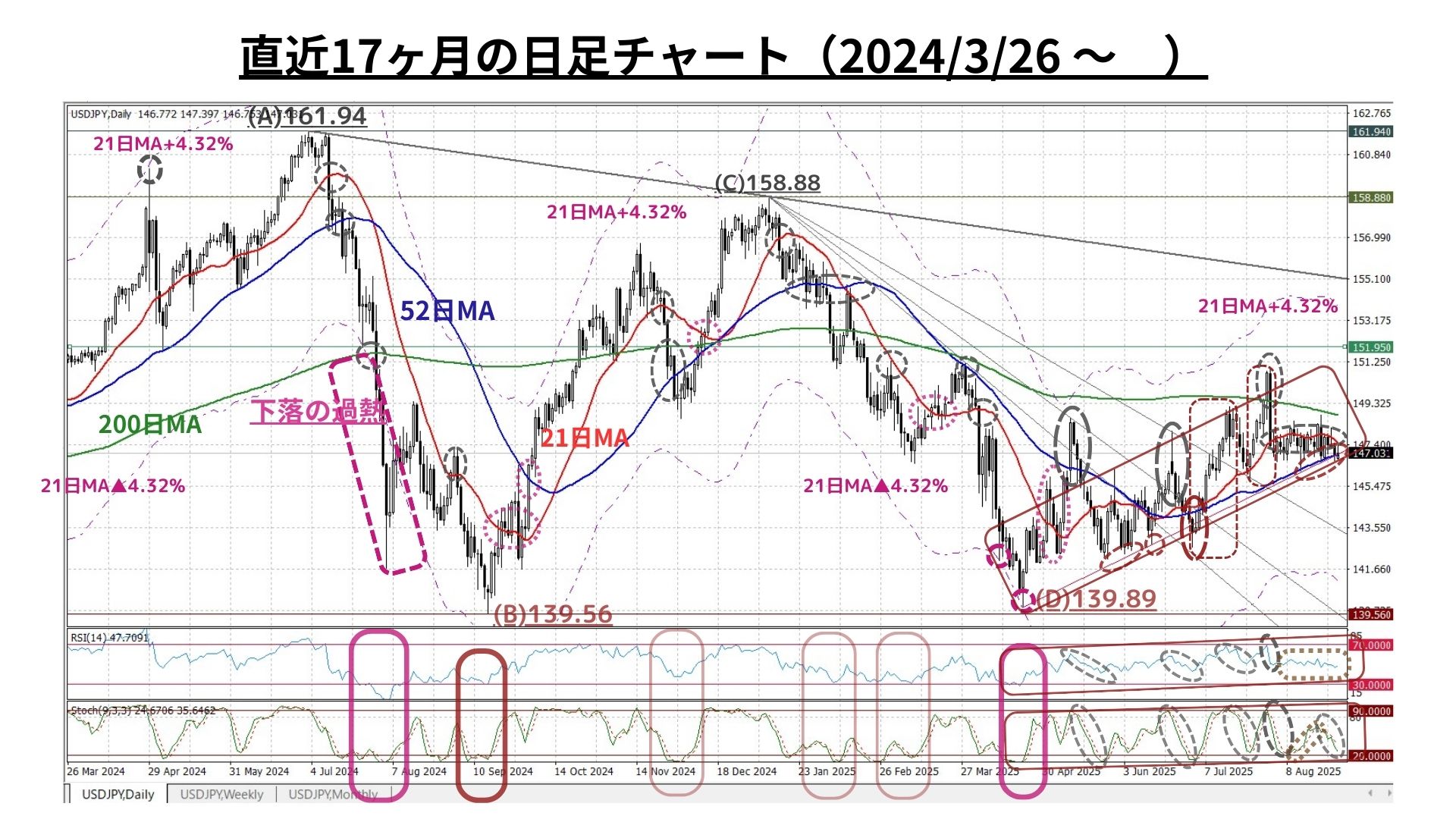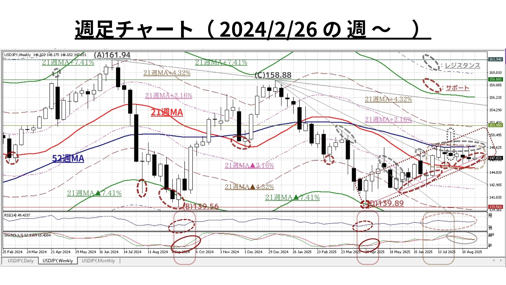 =>ただし、明確に21週MA(145.50@8/22)超の水準を上回っている現状ではあるが、52週MA(148.74@8/29)未満であり「過熱感は全くない(RSIやストキャスティクスも中立水準)」