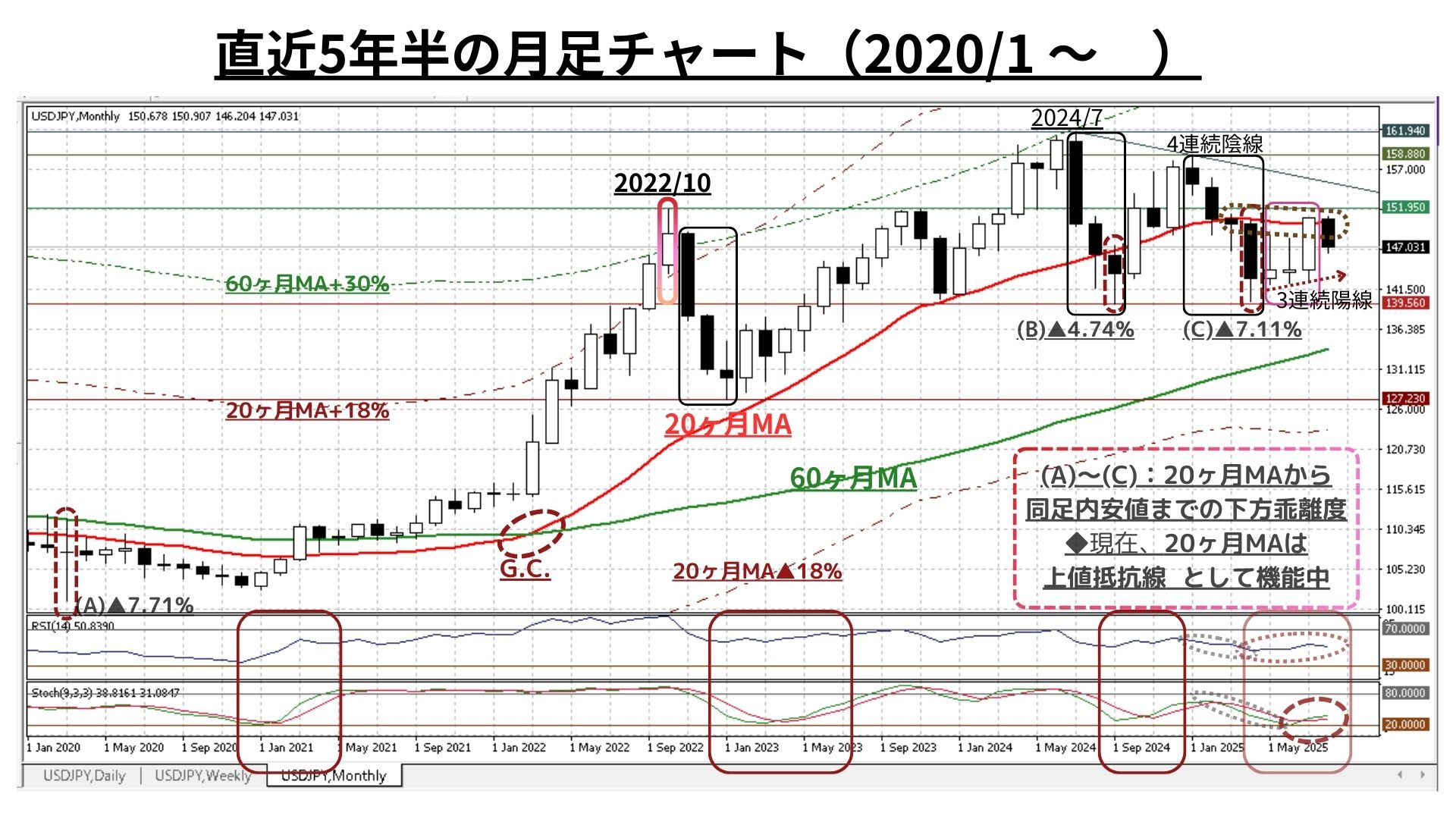 ➌月足チャート:「20MA±18.0%のバンド」「60MA±30.0%のバンド」、RSIを付記