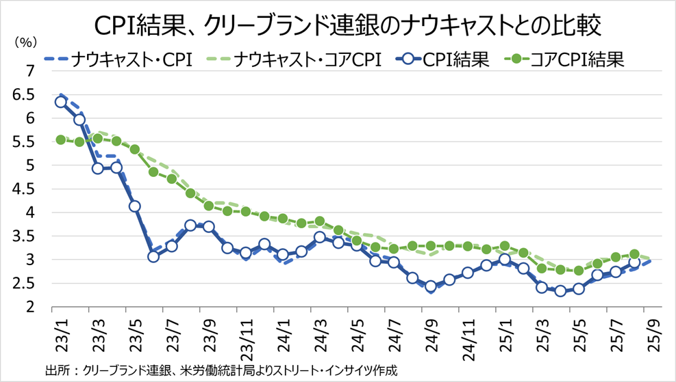 米政府機関の閉鎖を受けながら、米労働統計局は10月24日に米9月消費者物価指数(CPI)を発表する予定だ。クリーブランド連銀のナウキャスト、米9月CPIにつき前年同月比3.0%(前月:2.9%)コアCPIは3.0%(前月:3.1%)と、コアCPIの鈍化が見込まれている。こうした予想に沿う結果ならば、10月利下げを後押しするだろう。
