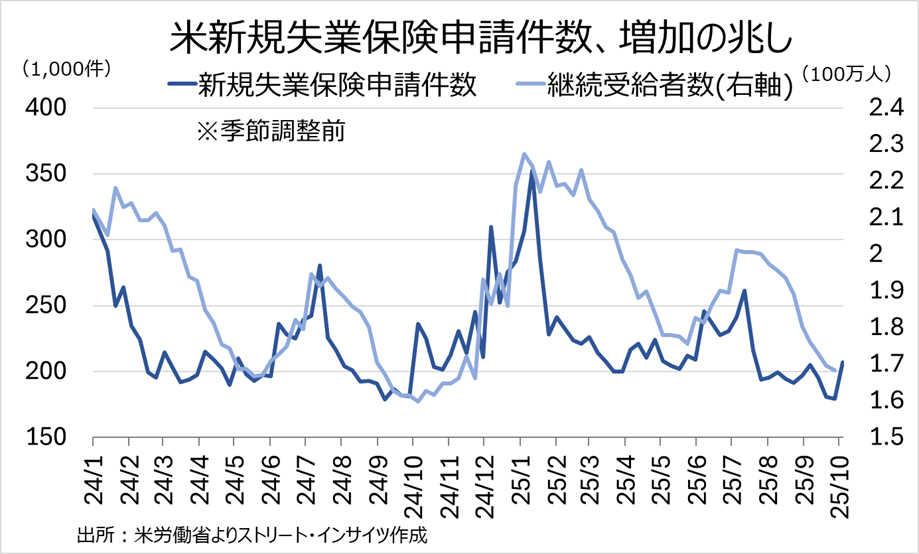 一方で、州別の米新規失業保険申請件数を集計したところ、季節調整前で10月4日週に20.7万件と7月中旬以来の高水準だった。パウエルFRB議長は、10月14日の講演で「失業率が上昇に転じる地点に近づいている」と警鐘を鳴らした。トランプ政権が米連邦政府職員の大型リストラに着手することもあり、労働市場の明確な減速を確認するなら、FF先物市場が織り込むように、10月と12月と2回にわたる利下げが見込まれる。