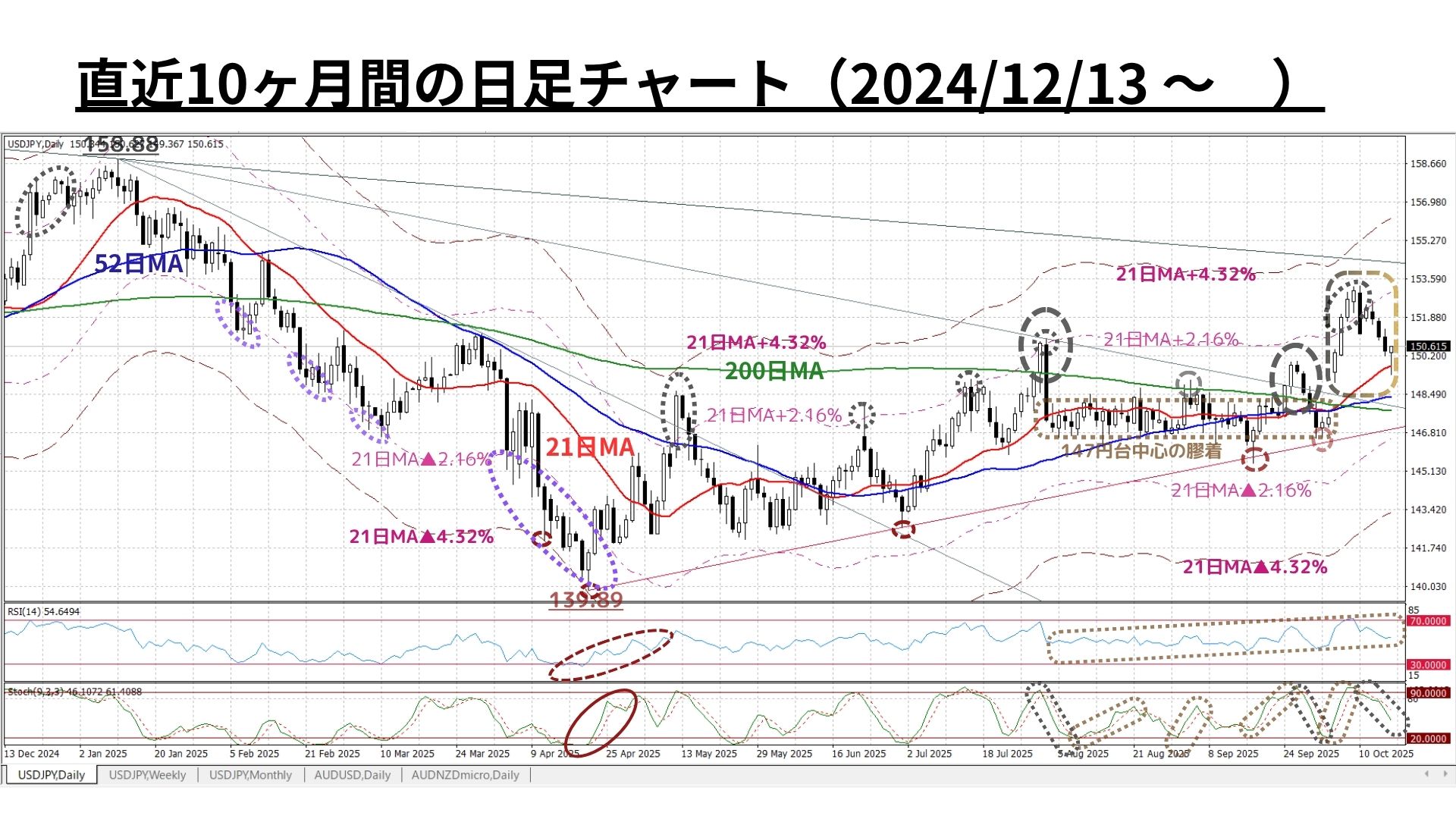 ◆10/6週の「日足で“大マド”を空けて急伸」した展開から一転、短期的な過熱状態を自律的に調整する展開。直近の2週はその前の2週と同様に「2週間かけて“行って来い”」の推移となった