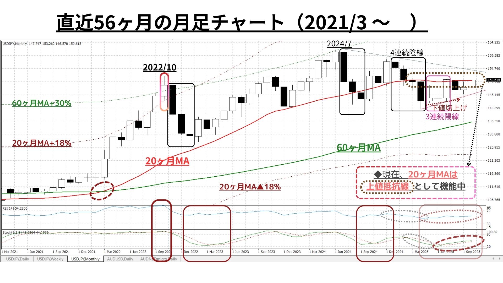➌月足チャート:「20MA±18.0%のバンド」「60MA±30.0%のバンド」、RSIを付記