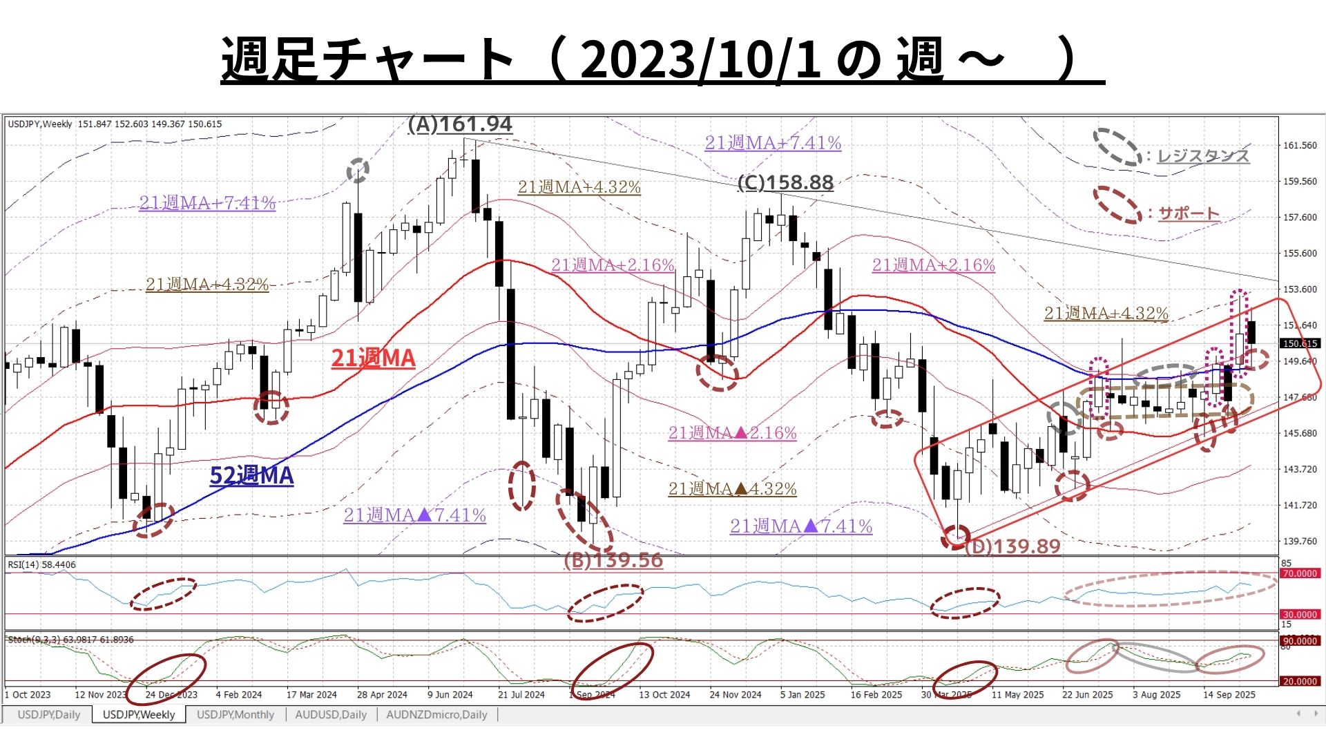 ➋週足チャート:「21MA±4.32%/±7.41%/±9.87%のバンド & 52MA」、RSI等