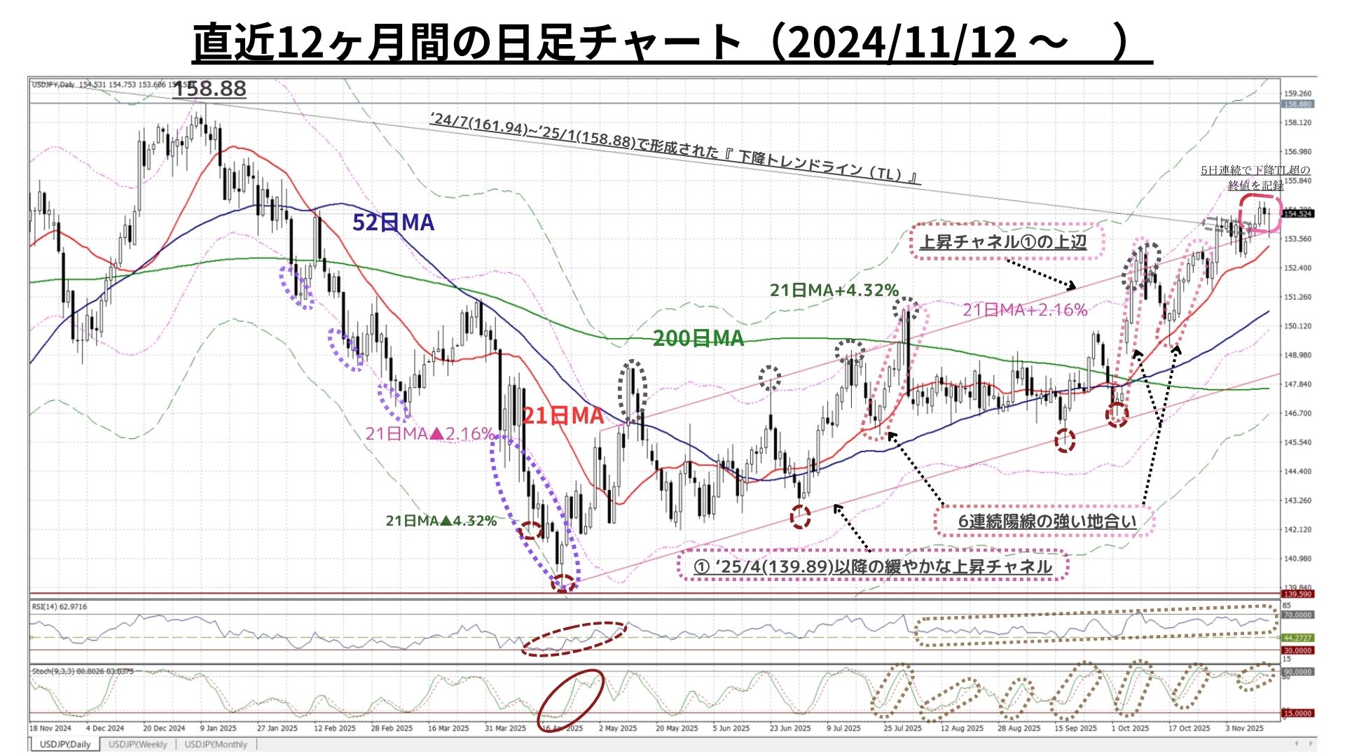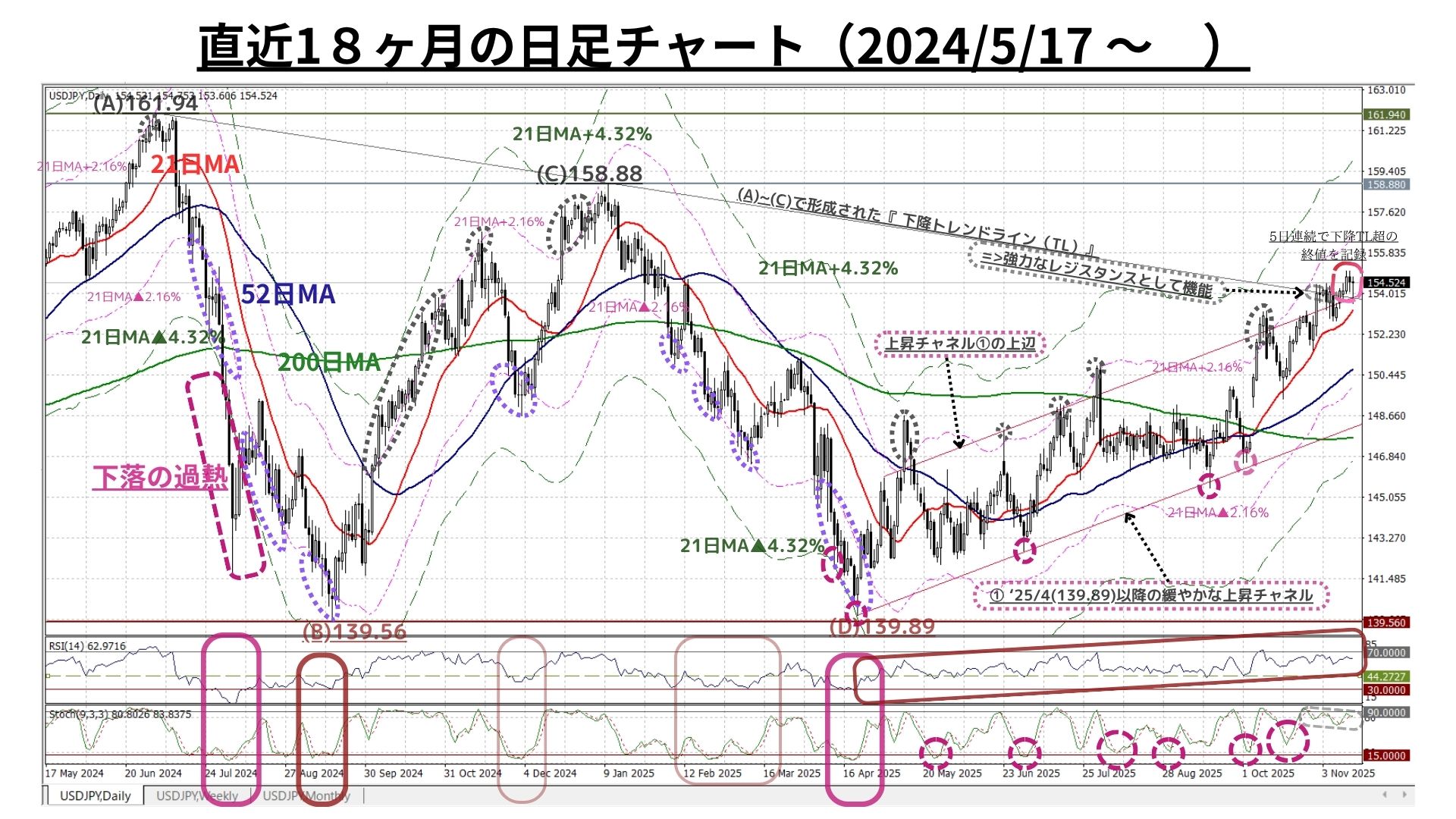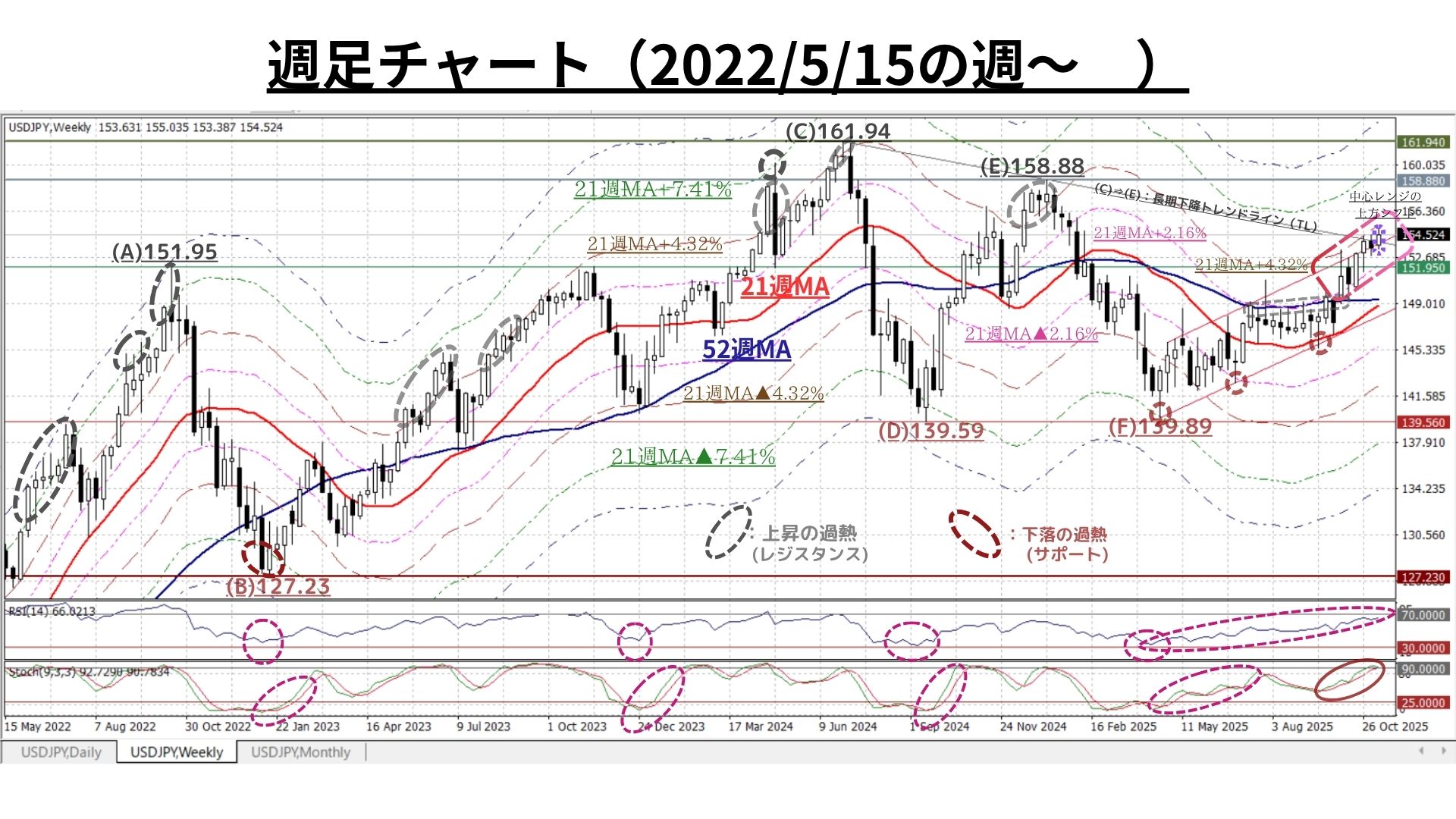 ◇それでも、10月以降の上昇モメンタムは強力で、根強い押し目買い圧力により前週の終値水準で反発に転じ154円台半ばまで戻して越週した結果、既述の長期下降TLを終値で上回る陽線を形成。これに伴って取引の中心価格帯(レンジ)も大幅に上方シフト