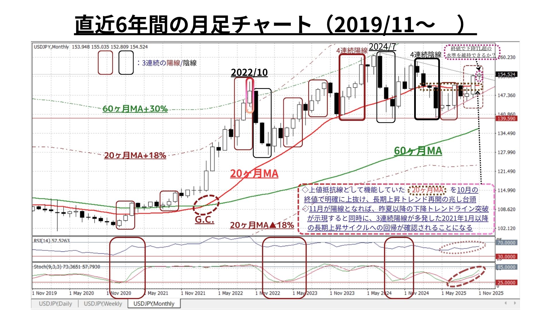 再掲という形を取らせて頂きましたが、我々のUSD円に対する分析/判断の根幹をご理解頂けたでしょうか。もちろん現在は当時には無かった「高市政権誕生」などの新たな要因が加わっていますが、根底の部分は大きく変化していないと考えています。また、テクニカル分析でも強調した通り「長期上昇(“円安”/USD高)トレンド本格化の再開」が今後更に進展すると見ています。