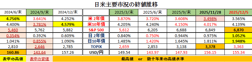 □先週の日米金融市場の変化(下表右端):米利下げ/日利上げの織込みが進展