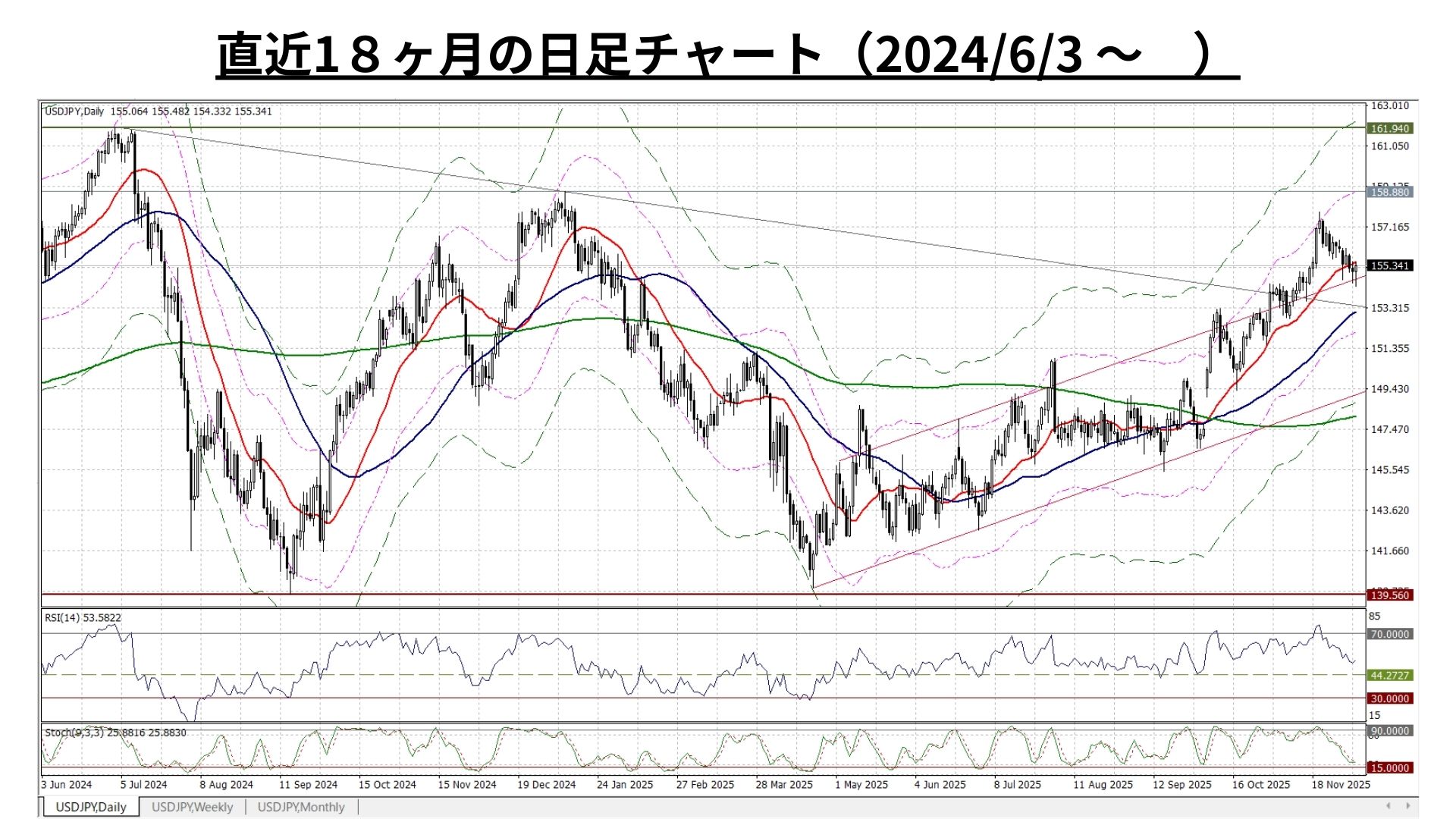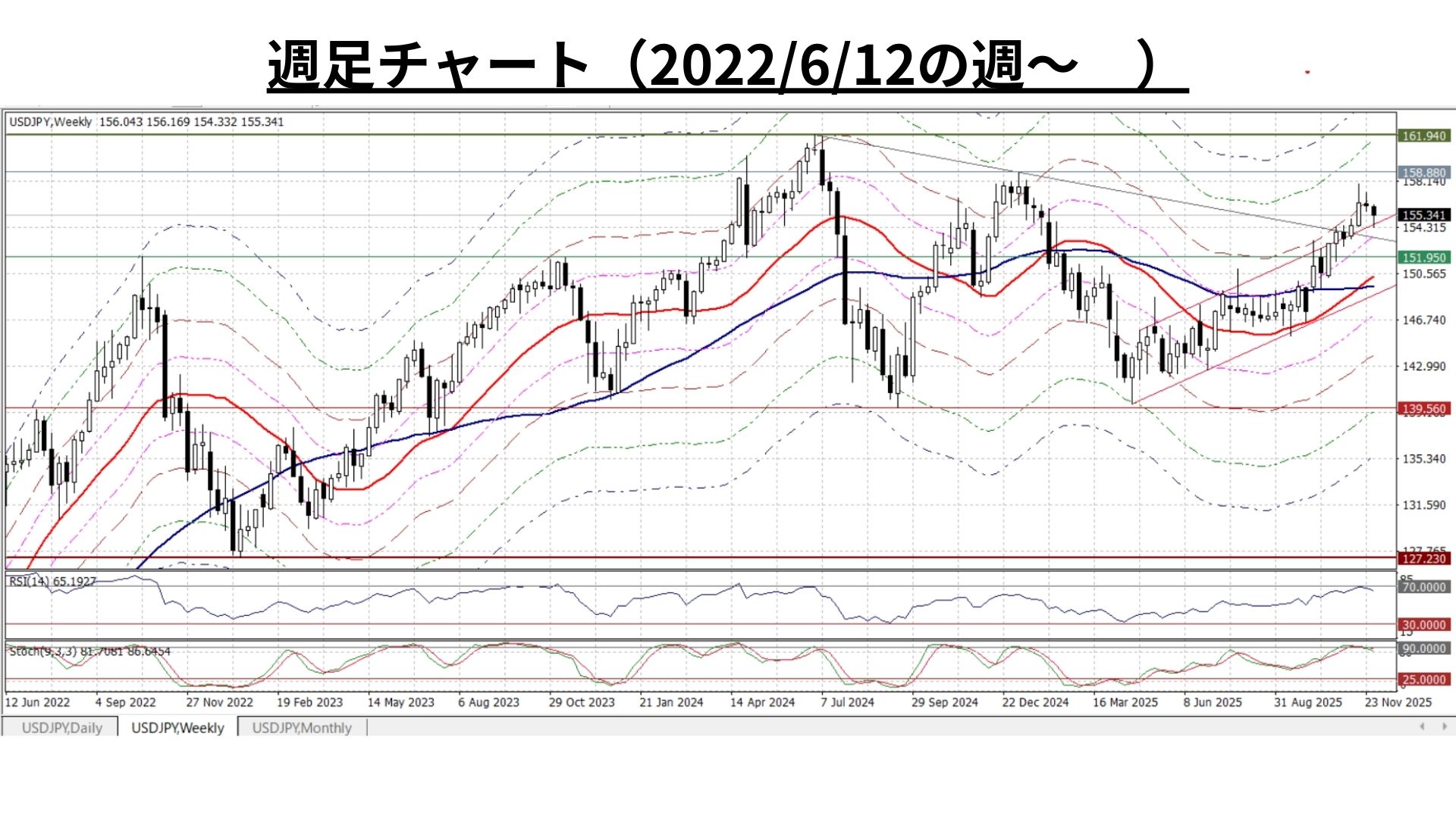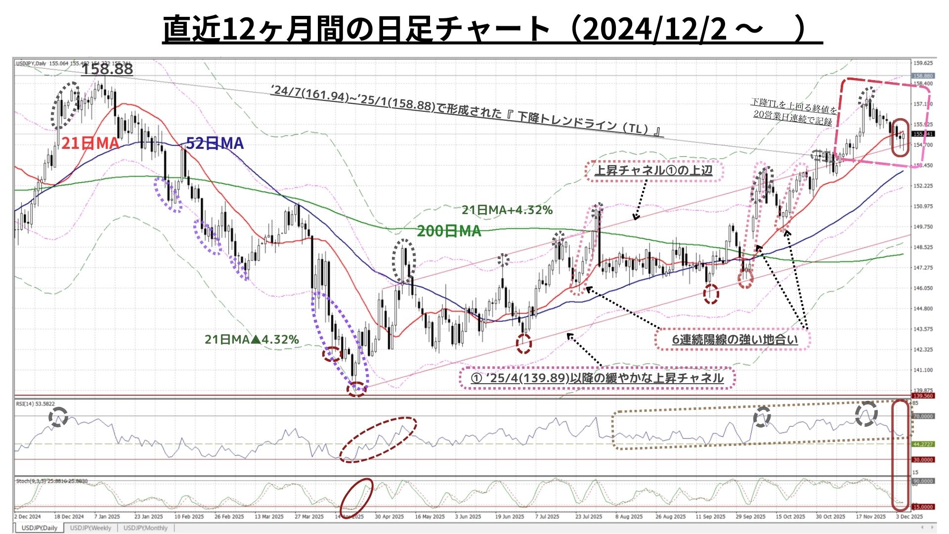 - ただし、上記の21週MA+4.32%は11/24週から明らかに上値抵抗線として機能。158円に急接近した11/17週はこの水準を上回る終値だったが、同時に「RSIが一時的ながら72超」となるなど『上昇の過熱』を観測し、その後は自律調整色が高まり2週連続の陰線を観測