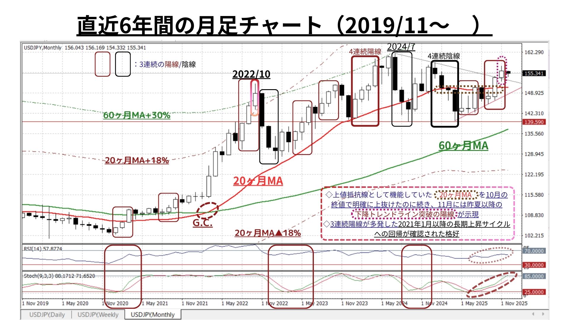➌月足チャート:「20MA±18.0%のバンド」「60MA±30.0%のバンド」、RSIを付記