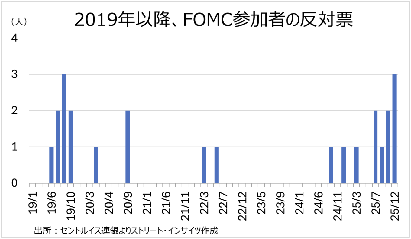 反対票は前回に続きミランFRB理事(0.5%利下げ)と、カンザスシティ連銀総裁(据え置き)の他、シカゴ連銀総裁が新たに据え置き票に加わり、3人となる。3人の反対派、2019年9月以来で、当時は同年7月から11月まで、3回にわたり0.25%利下げを行っていた。