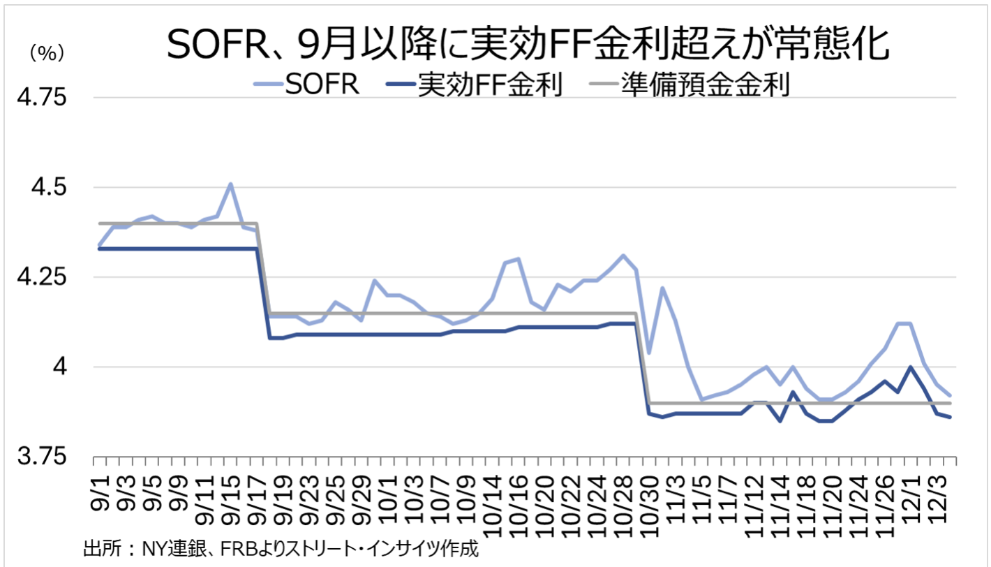 振り返ると、Fedは、10月FOMCで12月1日からの量的引き締め(QT)停止を決定。これは、金融システムに十分資金が行き渡ってないリスクへの対応と判断されたためだ。QT停止前までの資産縮小の影響に加え、Tビルを含む米国債の大量発行が続いた結果、銀行の流動性を示すバロメーターである準備預金残高は、12月3日週に2兆8,580億ドルに減少していた。