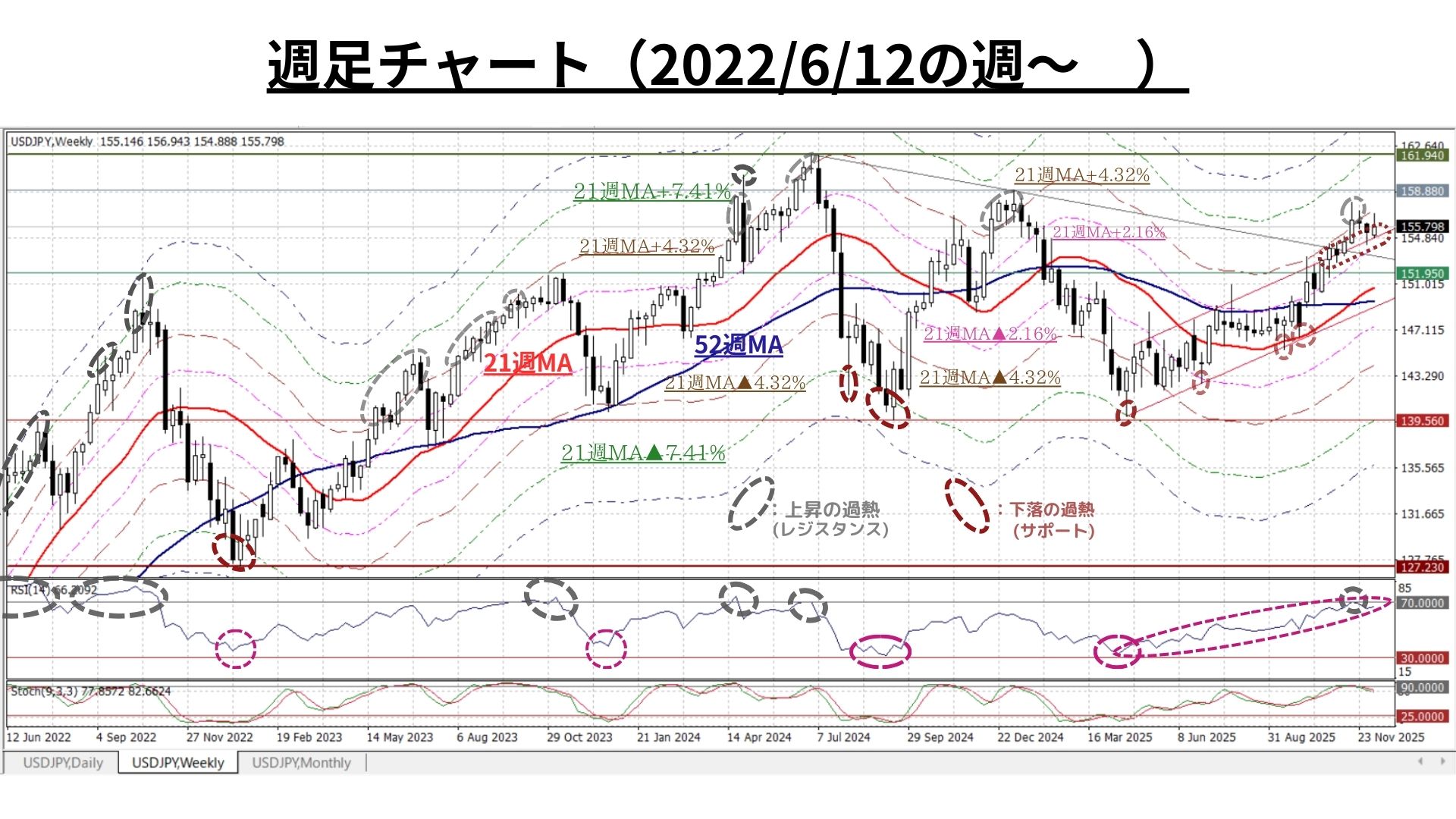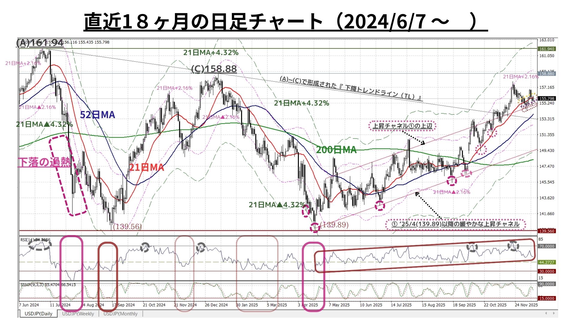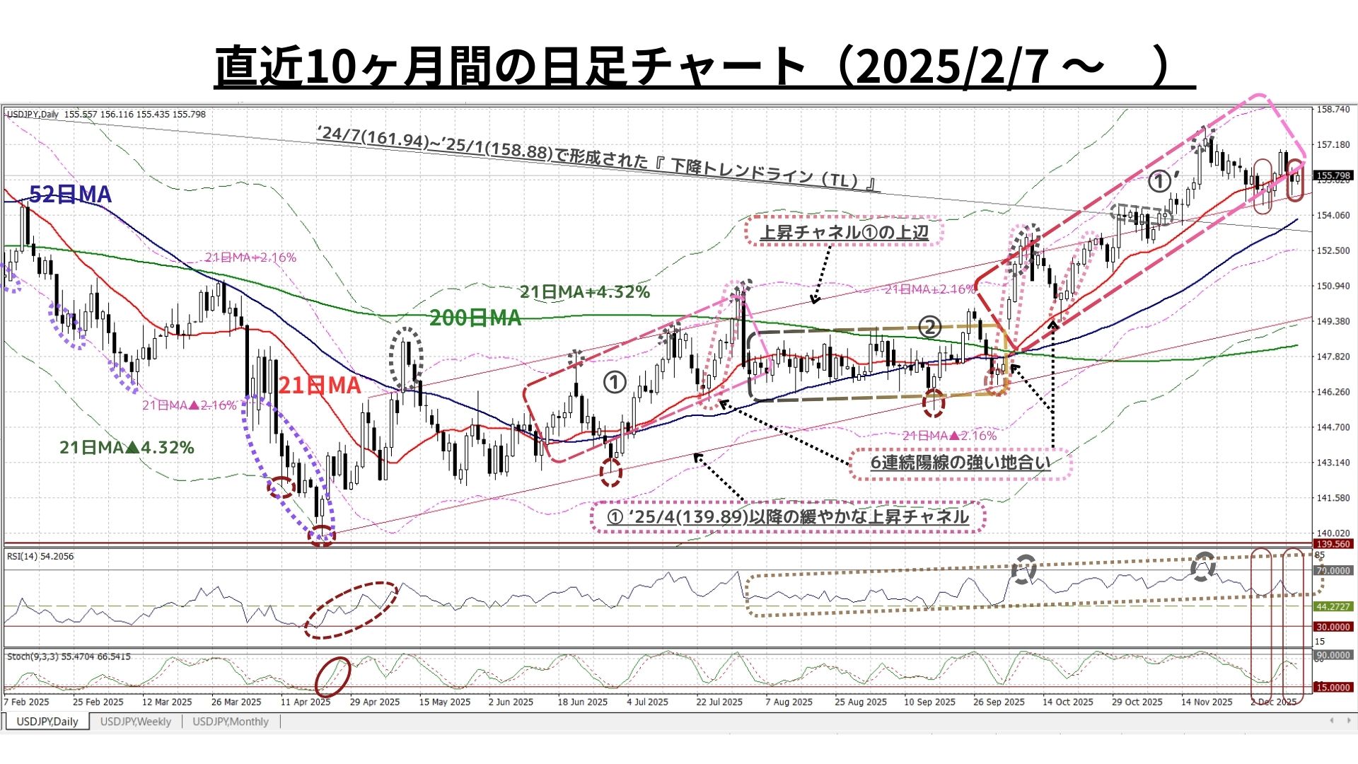 ⇒こうした状況下、仮に調整的展開へ移行するとしても「変化の速い21日MA近辺での保合い」に止まる可能性が高いのではないか。いずれにせよ「今週後半には『弱含みから横ばいに転じてくる21日MA』とUSD円相場の終値の水準に注目すべき局面が続こう