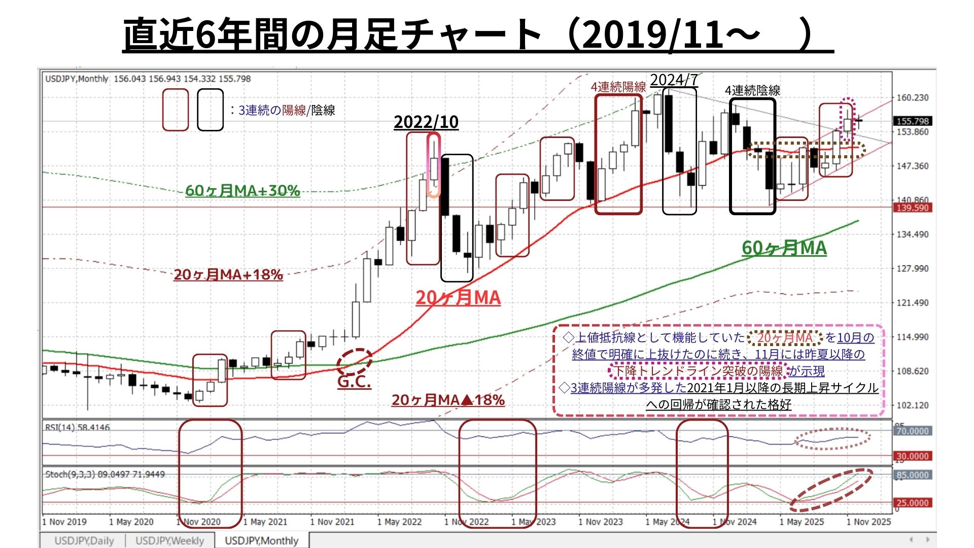 ◇上値抵抗線として機能していた 20ヶ月MA を10月の終値で明確に上抜けたのに続き、11月には昨夏以降の下降トレンドライン突破が示現。3連続陽線が多発した2021年1月以降の長期上昇サイクルへの回帰が鮮明となった。