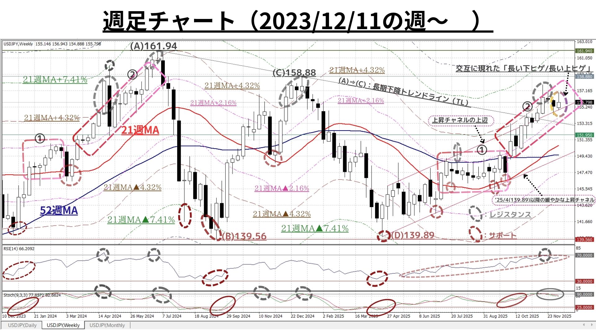 - 11/10週に『(A)⇒(C)の下降トレンドライン(TL)』を終値ベースで上方突破したことで「長期上昇トレンド再開」が示唆された