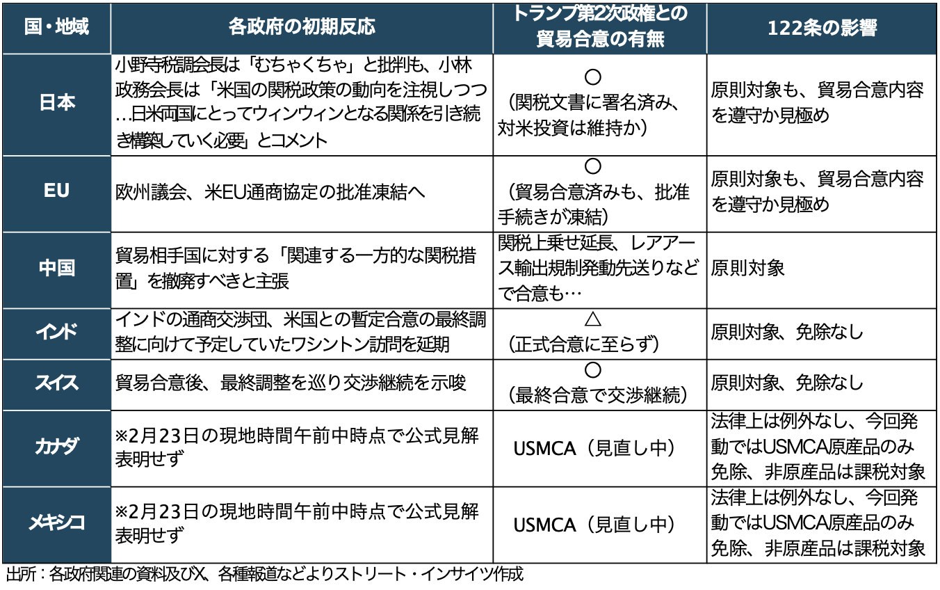 IEEPAの違憲判決後、インドは暫定貿易合意の最終交渉に向け訪米予定だった通商代表団の派遣を見送った。EUは2月23日に緊急会合を開き、貿易協定の承認手続きをグリーンランド問題発生時に続き、再び凍結。グローバル一律関税15%をめぐる不確実性を挙げ、米国が合意内容の順守を明確化する必要性を訴えた。日本は、小野寺税調会長が「むちゃくちゃ」と批判するも、小林政調会長は「動向を見極めつつ、日米両国にとってウィン・ウィンとなる関係を引き続き構築していく」とコメント。高市首相とトランプ氏との米国での会談を3月19日に控え、対米投資の継続を示唆する構えを打ち出す。一方でスイスは、貿易合意を経て最終調整に向け交渉を継続する方針だ。