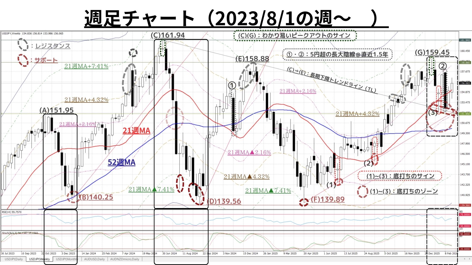 ➋週足チャート:「21MA±4.32%/±7.41%/±9.87%のバンド & 52MA」、RSI等