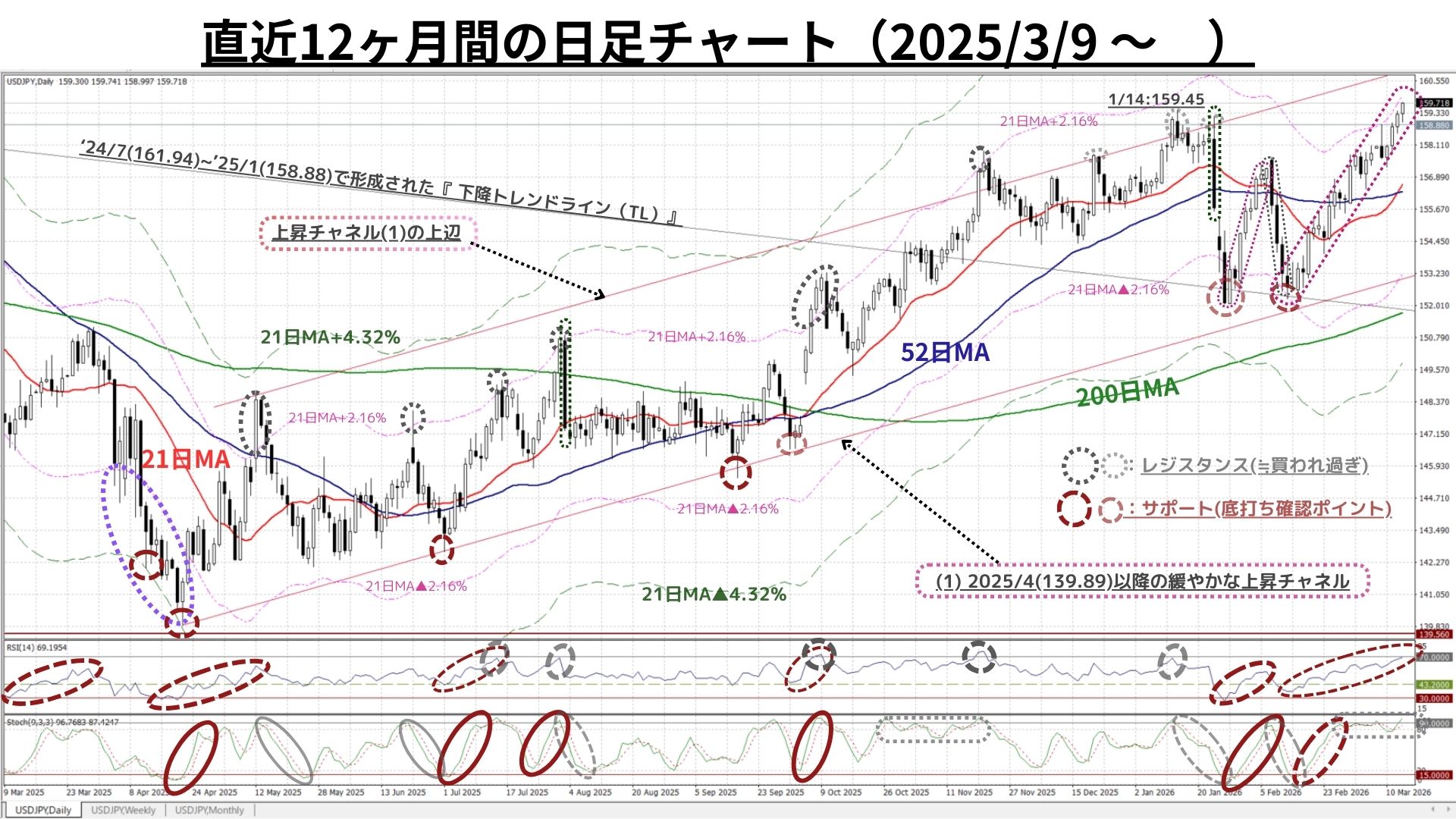 ➊日足チャート:「21MA±4.32%のバンド、52MA & 200MA」、RSI等
