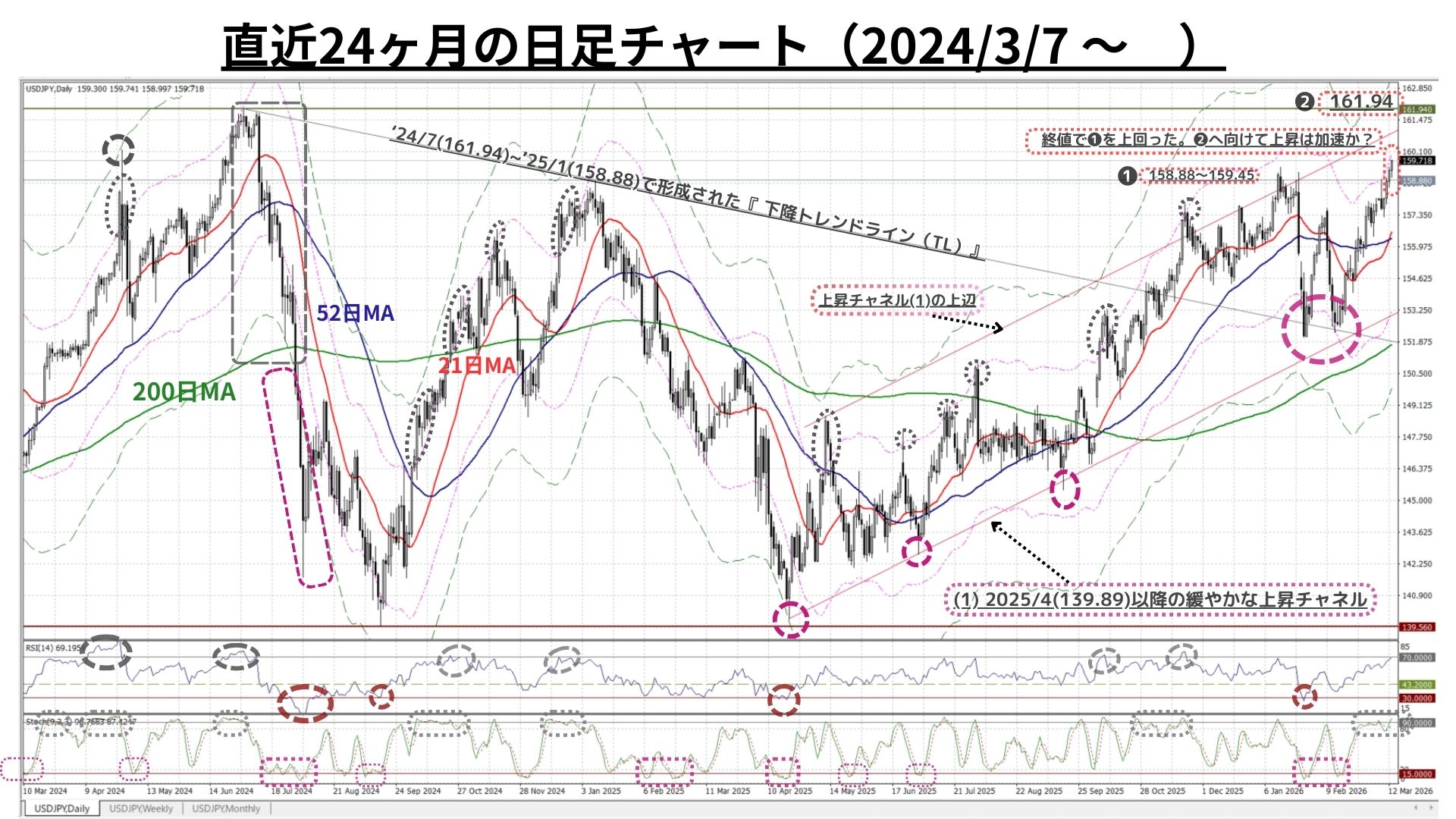 ◆超長期上昇トレンドの鮮明化に伴い、ストキャスティクスはかなりの高水準へ差し掛かり、既にピークアウトの兆しも無いとは言えない。しかし、週足でも指摘の通り2024/7月の161.94を終値で超えれば、2021-22年同様、9-18ヶ月もの期間RSIやストキャスティクスが高止まりする『上昇の過熱』も起こり得る