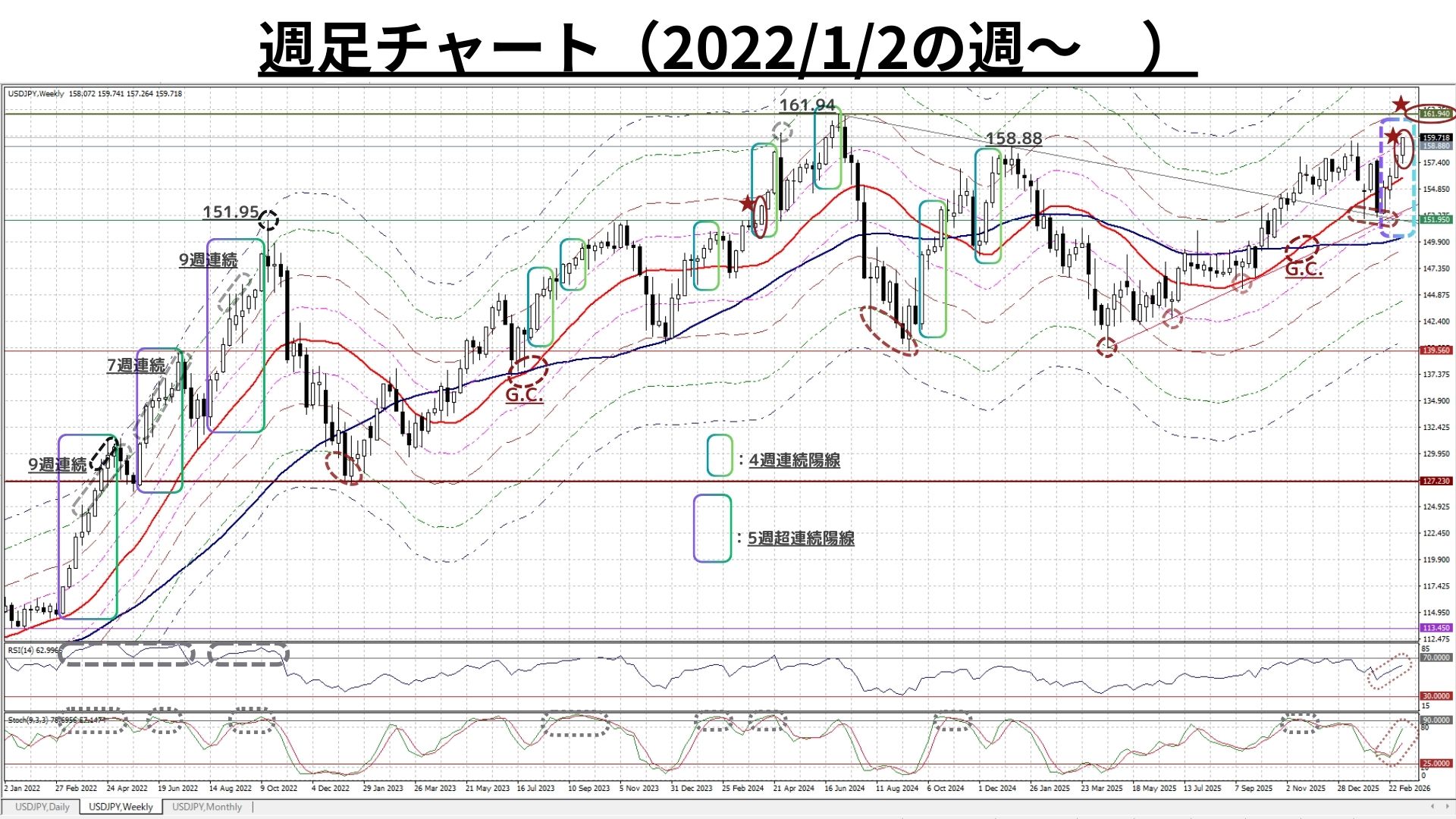 ◎先週の「注目点」とした、2025/1/10の高値(158.88)を「終値・2日以上連続で超えられるか」は週末にかけて顕現化
