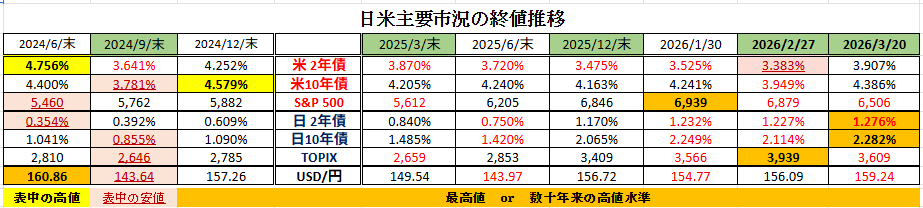 □先週の日米金融市場の変化(下表右端):イラン紛争/原油高で金融市場大荒れ