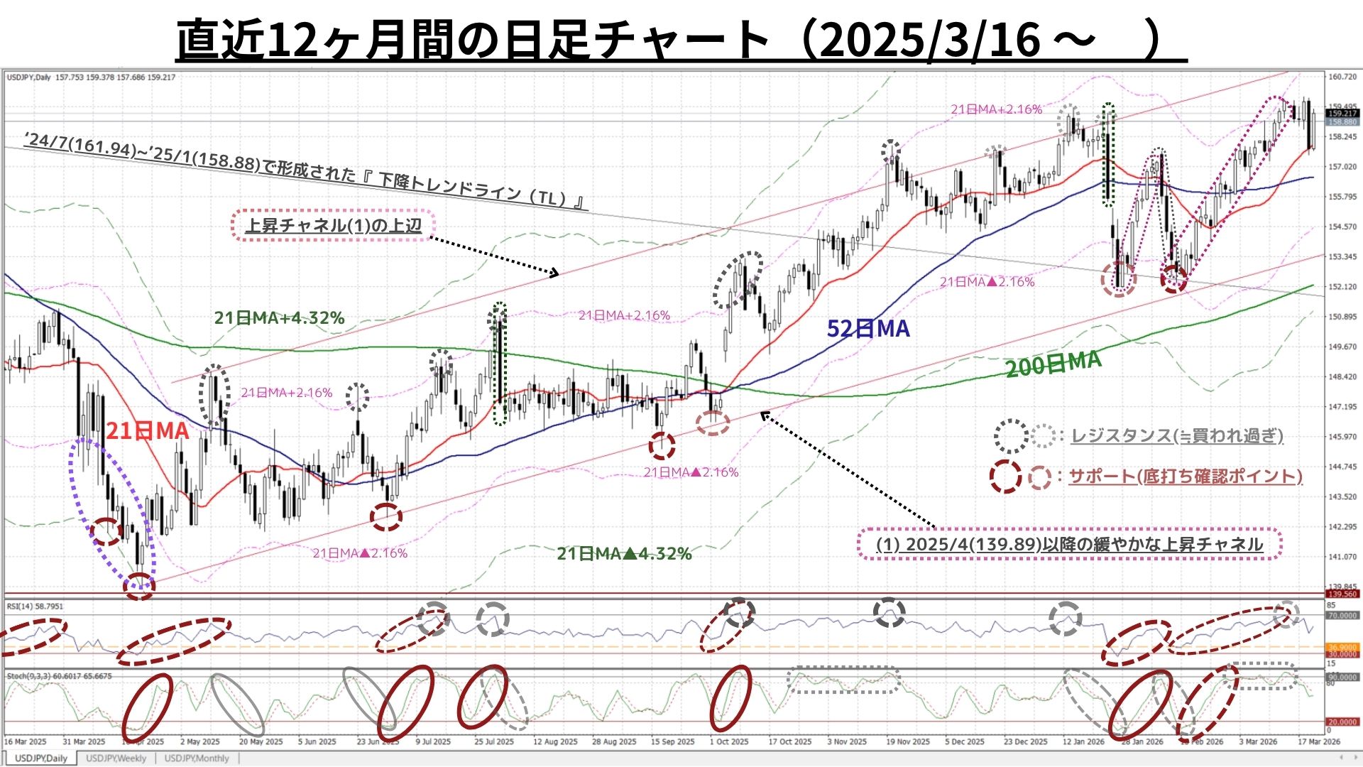 ➊日足チャート:「21MA±4.32%のバンド、52MA & 200MA」、RSI等