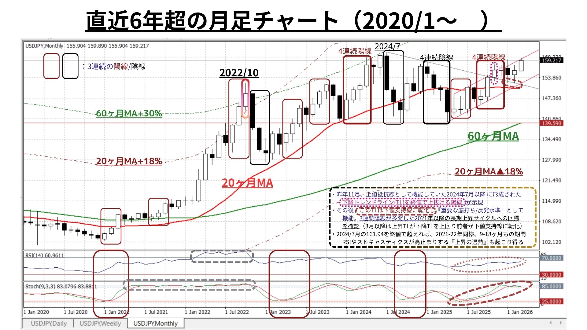 ➌月足チャート「20MA±18.0%のバンド」「60MA±30.0%のバンド」、RSIを付記
