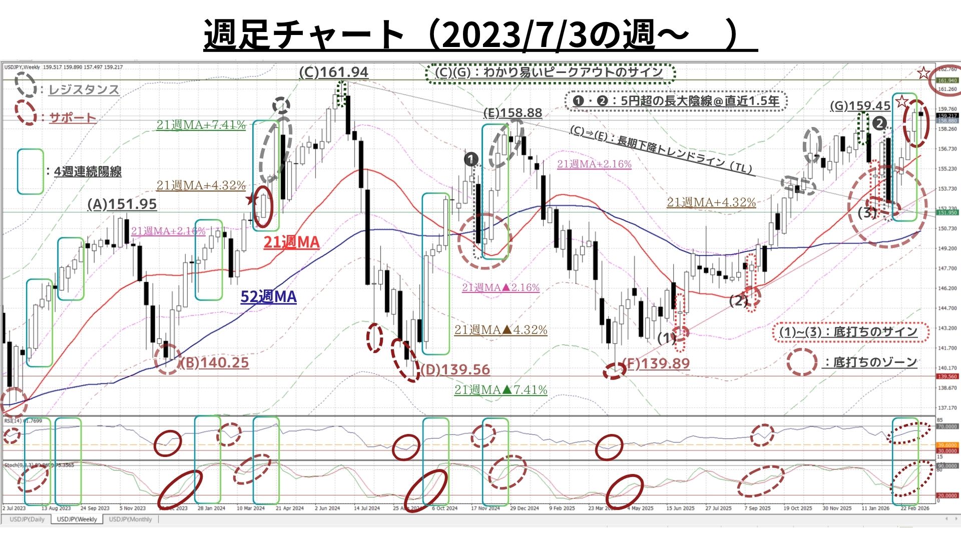 ④2022年以来の5連続(超)の陽線とはならなかったものの、(E:158.88)以降は最長3週に止まっていた連続陽線が、今回4週に進展し(E)以前には多発していたペース(勢い)を回復