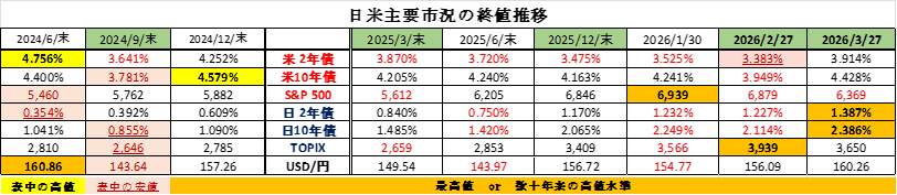 一方、今朝9:30時点のTOPIXは3,525程度で取引されており、これで計算すると2月末からの下落率は▲10.5%と2桁に達し、原油価格高騰に弱い日本を印象付けています。また最後に付記したNYダウも2/10につけた50,188ドルの高値から遂に2桁の下落となり「調整局面入り」を懸念する声も聞こえてきました。そろそろ「(トランプが)“TACO”ってくる」頃かもしれません。ただ、今回はその効果には甚だ疑問が残りますが…。