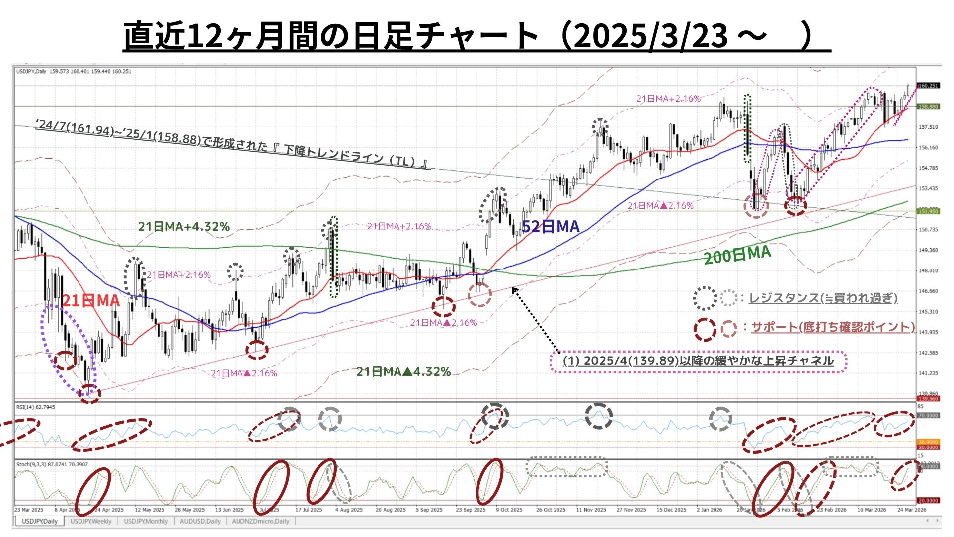➊日足チャート:「21MA±4.32%のバンド、52MA & 200MA」、RSI等