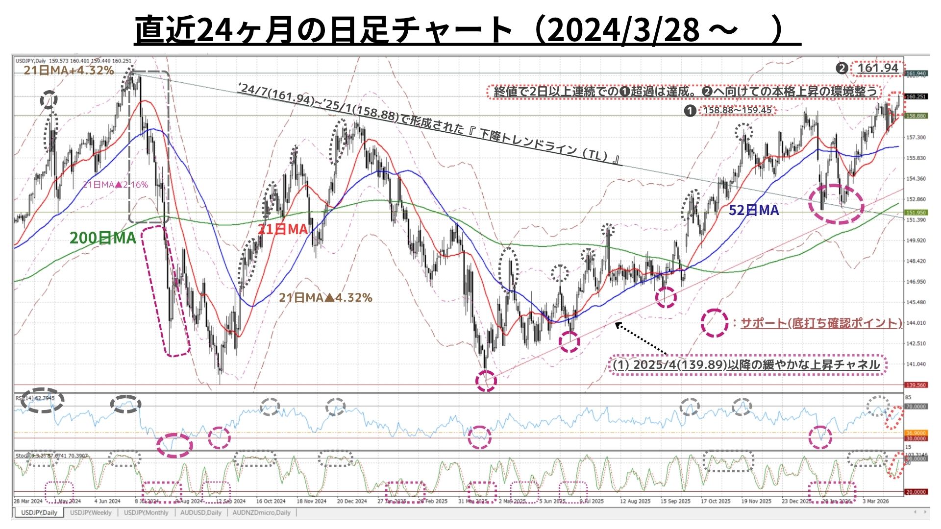 〇上記週足と同様、週初こそ下落先行も21日MAの水準でキッチリ底打ちした後、週末にかけて大きく反発。2024年7月以来1年8か月ぶりに160円台を終値で回復
