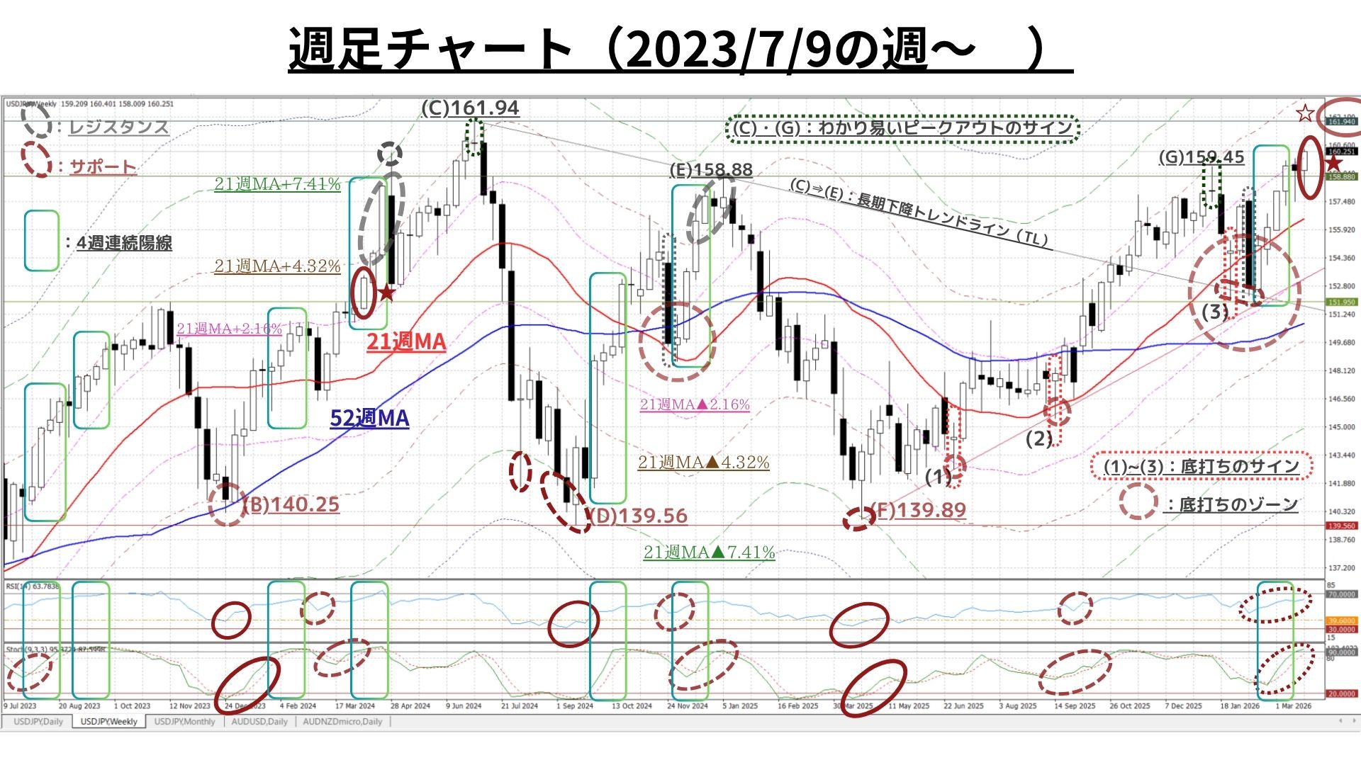 ➋週足チャート:「21MA±4.32%/±7.41%/±9.87%のバンド & 52MA」、RSI等