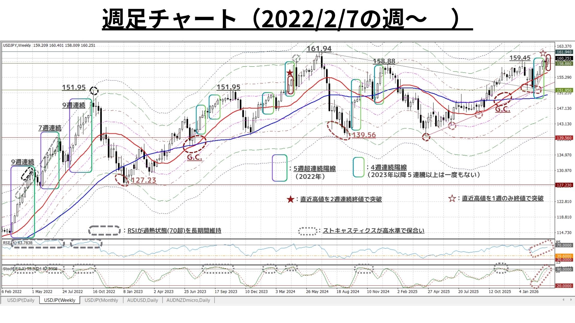 ④前週、2022年以来の5連続(超)の陽線とはならなかったものの、(E:158.88)以降は最長3週に止まっていた連続陽線が今回4週に進展し、(E)以前には多発していたペース(勢い)を回復した可能性あり